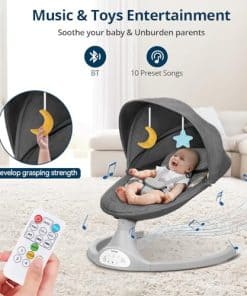 1. Arnés y Red Protectora Desmontable: La correa de seguridad de 5 puntos protege la seguridad del bebé, y la tela es amigable con la piel y suave. La red protectora desmontable aísla el polvo y los mosquitos. Colgar pequeñas muñecas puede mejorar la diversión del bebé y entrenar la reacción de agarre del bebé. 2. 5 Velocidades de Balanceo Múltiples Científicas: El columpio para bebés presenta las 5 velocidades de balanceo únicas: 18-21-23-25-31 para reconfortar a su bebé. El diseño ergonómico de inclinación de la columna vertebral a 25 cuida del crecimiento de la columna vertebral de su bebé. Adecuado para bebés de 5-20 Lb, 0-6 Meses. 3. Control Remoto Bt y Temporizador: Conexión Bt al teléfono móvil para reproducir canciones de cuna sin restricciones; el control remoto le permite cuidar y reconfortar a su bebé a distancia, y los tres modos de temporizador ahorran energía a los adultos. 4. Instalación Rápida y Vida Conveniente: Solo se necesitan cinco minutos para que una persona instale, y es fácil de desmontar y de tamaño pequeño. El cojín del asiento se puede quitar y lavar para mantenerlo higiénico. 5. Diseño Moderno y Trendy: El diseño de arco aerodinámico y la cubierta de asiento suave lavable fácil de limpiar convierten a este columpio en el favorito de mamá. Bioby también ofrece servicio al cliente las 24 horas.