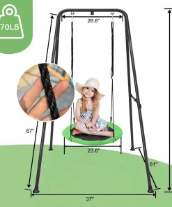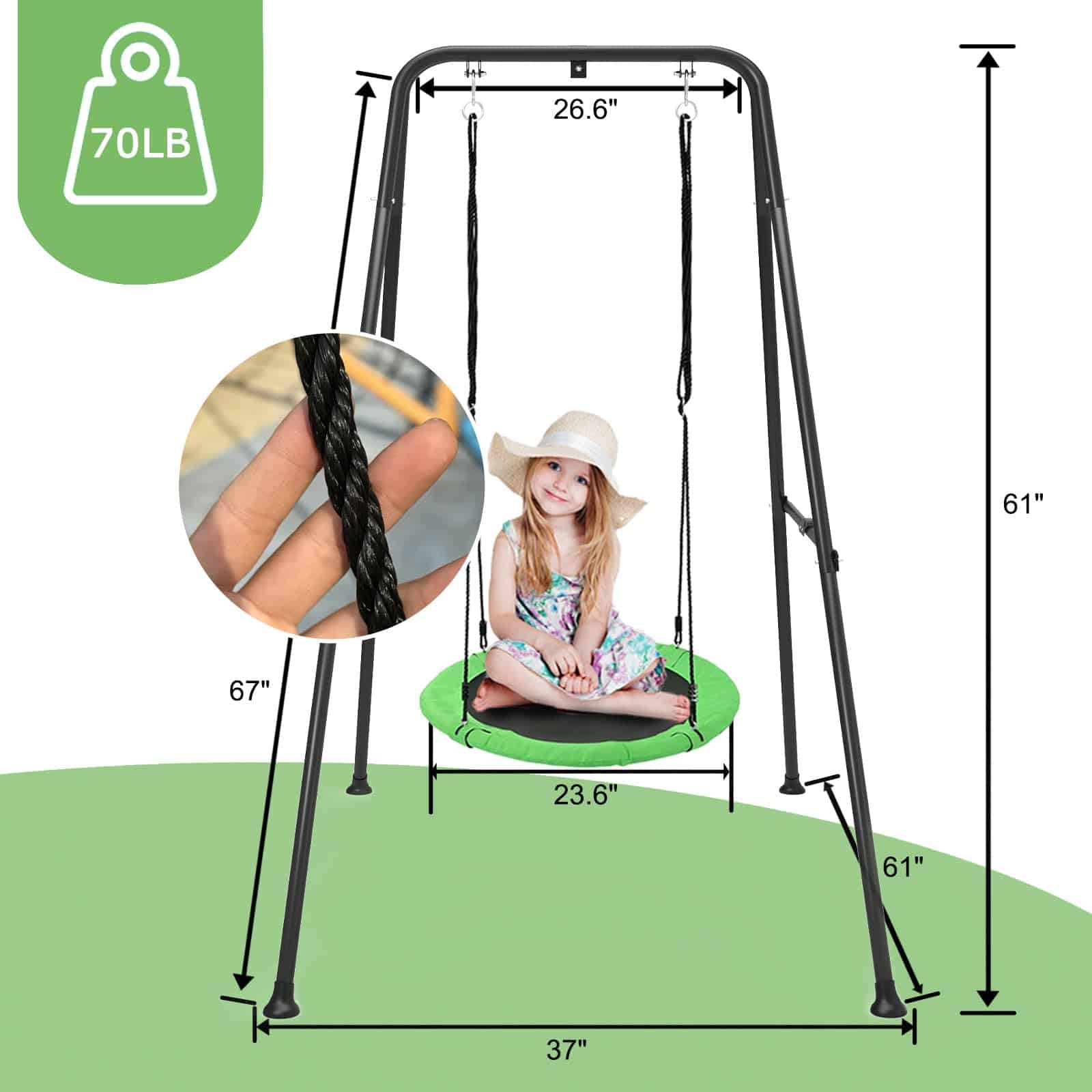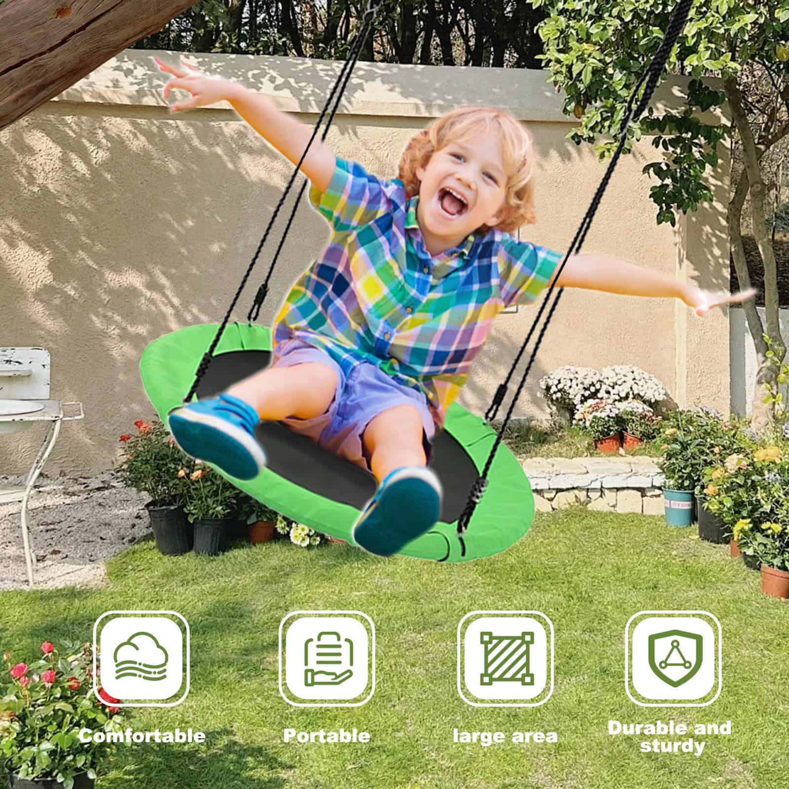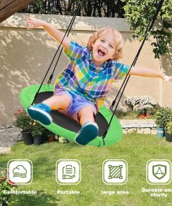 1. Columpio para niños Este columpio de plato para niños al aire libre consta de un soporte de columpio, base de plato y fuertes cuerdas y ganchos para una estabilidad excelente y practicidad ya sea que elijas colgarlo en interiores, exteriores o en un árbol. 2. Marco de metal de alta calidad La superficie del marco de metal está pintada con pintura en aerosol de alta calidad, pintura lisa y antiherrumbre; Y nuestro columpio de árbol se puede plegar para ahorrar espacio de almacenamiento, mientras que la parte inferior está equipada con clavos para el suelo para mejorar aún más la estabilidad; Permita que su hijo disfrute del columpio sin preocuparse por balancearse. 3. Combinación ultra estable Base del columpio de plato hecha de tela Oxford de alta calidad, diámetro de 24 pulgadas, creando un área de juego cómoda y segura y proporcionando una garantía confiable para el feliz juego de los niños. 4. Montaje fácil sin preocupaciones No tienes que preocuparte por el montaje en absoluto, nuestro columpio de plato con estructura viene con instrucciones detalladas y claras para ayudarte a montar o desmontar fácil y rápidamente para guardarlo en cualquier momento. 5. Selección de elección ideal Este columpio de plato volador es la elección perfecta para que los niños disfruten en cumpleaños, vacaciones, Navidad y otras ocasiones especiales, agregando felicidad y recuerdos interminables a la infancia de los niños, siendo la elección ideal para los niños.