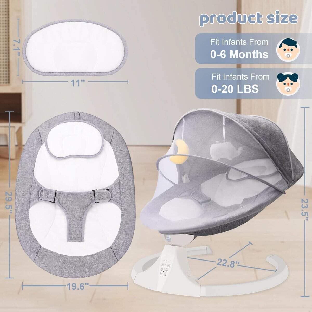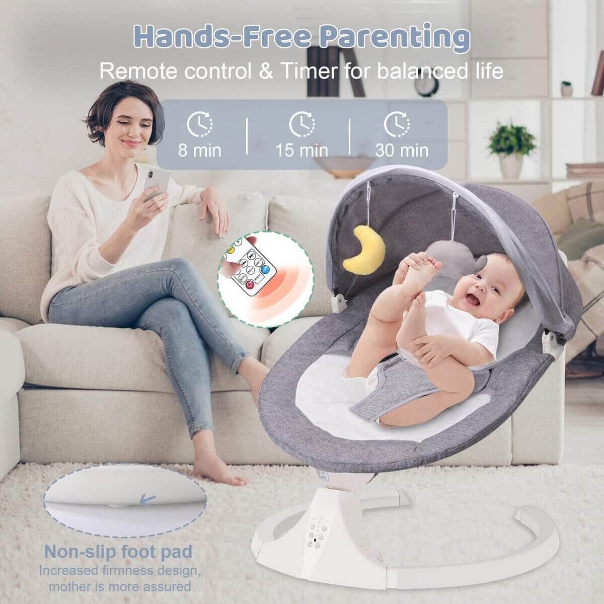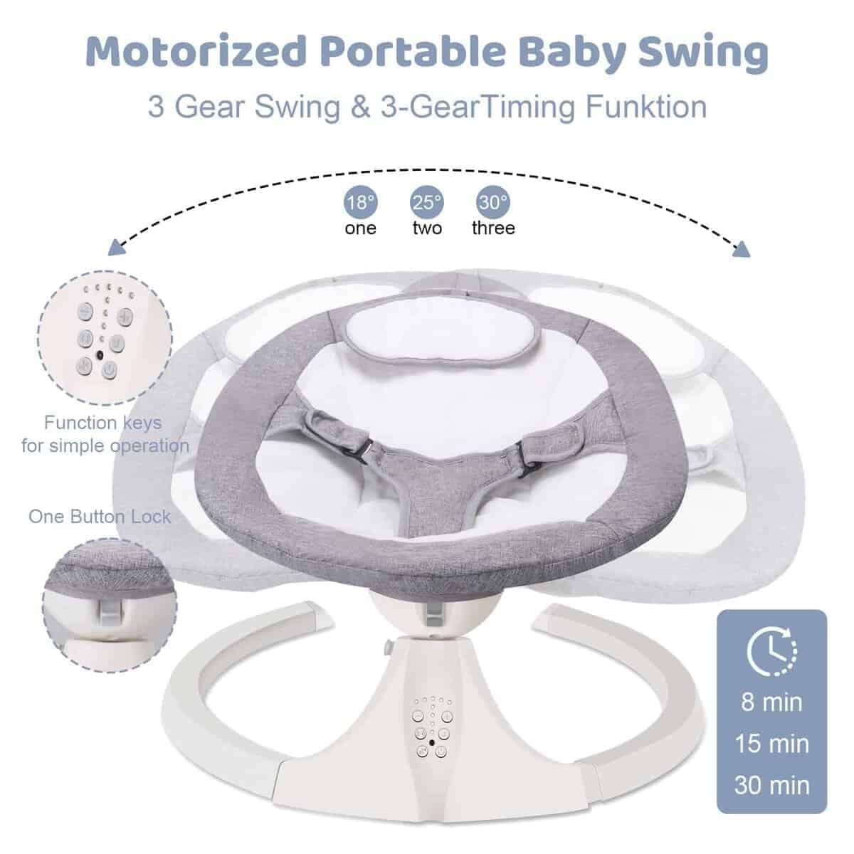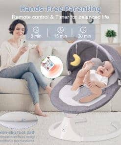 3. Versátil y fácil de usar: Equipado con conectividad Bluetooth, 5 velocidades de balanceo ajustables (que van desde 18 a 31 ), y 3 configuraciones de temporizador convenientes (8, 15 o 30 minutos), este columpio eléctrico para bebé ofrece una experiencia personalizable para calmar a su pequeño.