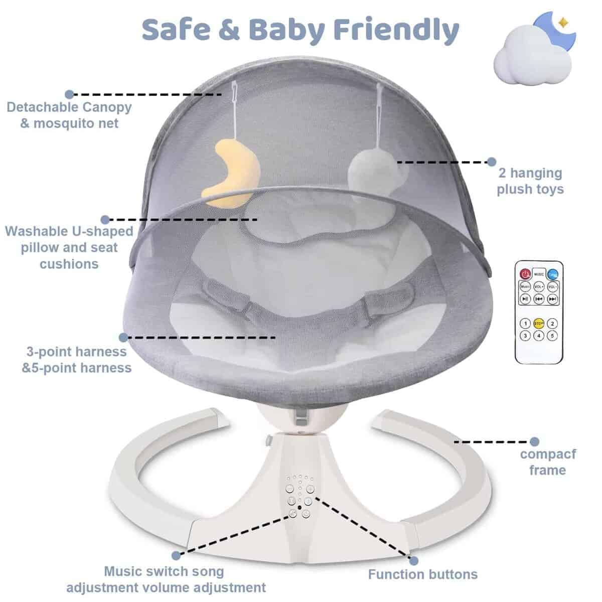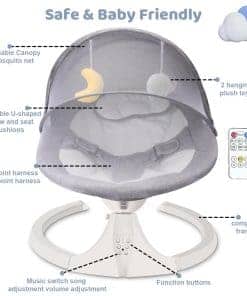 1. Características de seguridad excepcionales: Nuestros columpios eléctricos para bebés están equipados con un arnés de seguridad de 3 puntos y un diseño transpirable que permite a su bebé observar su entorno, garantizando la máxima comodidad y seguridad para bebés de 0-6 meses o hasta 33 lbs.
