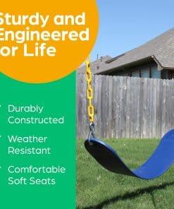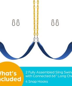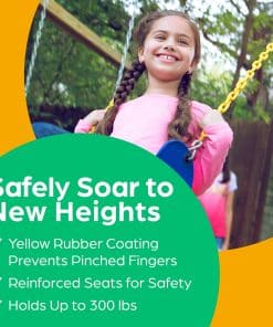 DIVERSIÓN Disfruta de muchas horas emocionantes de diversión familiar en el patio trasero con los asientos de columpios del parque infantil de JGK ahora en un paquete de 2, divertido para niños y adultos. Un asiento de columpio cómodo es una parte vital de tus accesorios de set de columpios al aire libre. Se puede usar como asiento de columpio de árbol o mediante una fácil conexión con los ganchos de columpio de Jungle Gym Kingdom. PESO Tu asiento de columpio flexible se adaptará a la mayoría y soportará el límite de peso de 300 libras. PELLIZCOS No olvides que las cadenas recubiertas de plástico protegen los deditos de los niños de los pellizcos. USO Combina bien con la barra Trapeze de Jungle Gym Kingdom de 18″, columpios de cubo para bebés / niños pequeños, columpios de disco de cuerda y otros accesorios de set de columpios. Este es el columpio suave perfecto para esos niños escaladores que se sujetan, así que déjalos sentarse y disfrutar de la comodidad que traerá su nuevo columpio a sus rostros sonrientes. ¡Disfruta! NOTA Recomendamos encarecidamente el uso de ganchos de columpio diseñados para permitir un movimiento de vaivén relativamente libre de fricción que los columpios requieren. Utilizar una fijación estacionaria causará fricción de metal con metal y es un motivo de preocupación por seguridad.