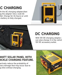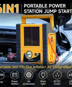 Colvxkun Estación de Energía Solar Portátil es la solución perfecta para tus necesidades de energía portátil. Con su batería recargable de 20Ah, este arrancador de batería es capaz de proporcionar una corriente máxima de 2000 amperios, permitiéndote arrancar motores de gas de hasta 8.5L y diésel de hasta 6.5L. Ya sea que necesites arrancar un camión, una motocicleta, un bote, una cortadora de césped, un SUV, un ATV o cualquier otro vehículo, este arrancador de batería te tiene cubierto. La pinza de arranque integrada proporciona alertas de alarma de polaridad inversa para garantizar un uso seguro en todo momento. Pero eso no es todo. Esta estación de energía portátil también cuenta con un panel solar de 5W que permite cargar la batería por goteo a la luz del sol, mejorando su vida útil. Con una capacidad de 20000mAh, suministra un inversor de potencia de 400W que te permite conectar tus dispositivos electrónicos dondequiera que estés. Además, con salidas AC/ DC/ USB, es perfecto para viajes, camping, cortes de energía de emergencia y cualquier otra necesidad al aire libre. El compresor de aire integrado de 260 PSI te permite inflar fácilmente neumáticos de coche, motocicletas, bicicletas, kayaks, colchones inflables y mucho más en cuestión de minutos. Con protección contra cortocircuitos, sobrecarga, conexión inversa, alta tensión, alta temperatura y cortocircuito, este cargador de batería de coche es seguro de usar en cualquier condición. Mantén la caja de arranque en tu coche para estar preparado para cualquier emergencia en tus viajes. En resumen, la Colvxkun Estación de Energía Solar Portátil es el compañero de viaje perfecto que te mantendrá funcionando en todo momento. ¡No salgas de casa sin él!