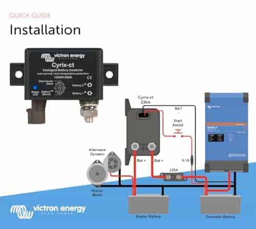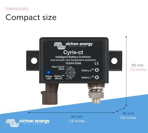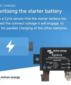 El Combinador de Baterías Inteligente Victron Energy Cyrix es un relé de alta resistencia controlado por microprocesador que conecta automáticamente las baterías en paralelo cuando una de ellas ha alcanzado un voltaje preestablecido (indicando que la batería se está cargando) y se desconecta cuando el voltaje disminuye por debajo del nivel de flotación (indicando que una o más baterías se están descargando). Los combinadores de baterías Victron Energy Cyrix son una excelente alternativa a los aisladores de diodos. La característica principal es que prácticamente no hay pérdida de voltaje, por lo que la tensión de salida de los alternadores o cargadores de baterías no necesita ser aumentada.