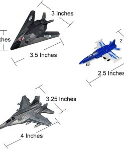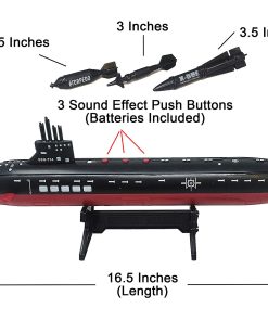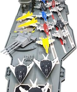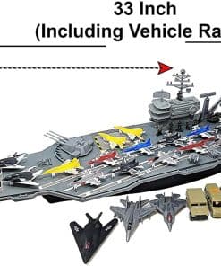 Dimensiones del Portaaviones: 33″L x 7″W x 3.5″H. Incluye: 18 Aviones de combate de colores surtidos con ruedas móviles, 10 soldados de fuerzas especiales miniatura, 2 vehículos de 2 pulgadas, 3 aviones de combate más grandes, y más. Incluye Destructor de juguete (sin efectos de sonido, no necesita baterías) y Submarino negro de 16.5 pulgadas con efecto de sonido. Submarino viene con 2 torpedos y 1 misil antirradar. No se mueven solos. El compartimento de la batería está en la parte inferior del submarino, por lo que no se debe sumergir en agua. No flotan.