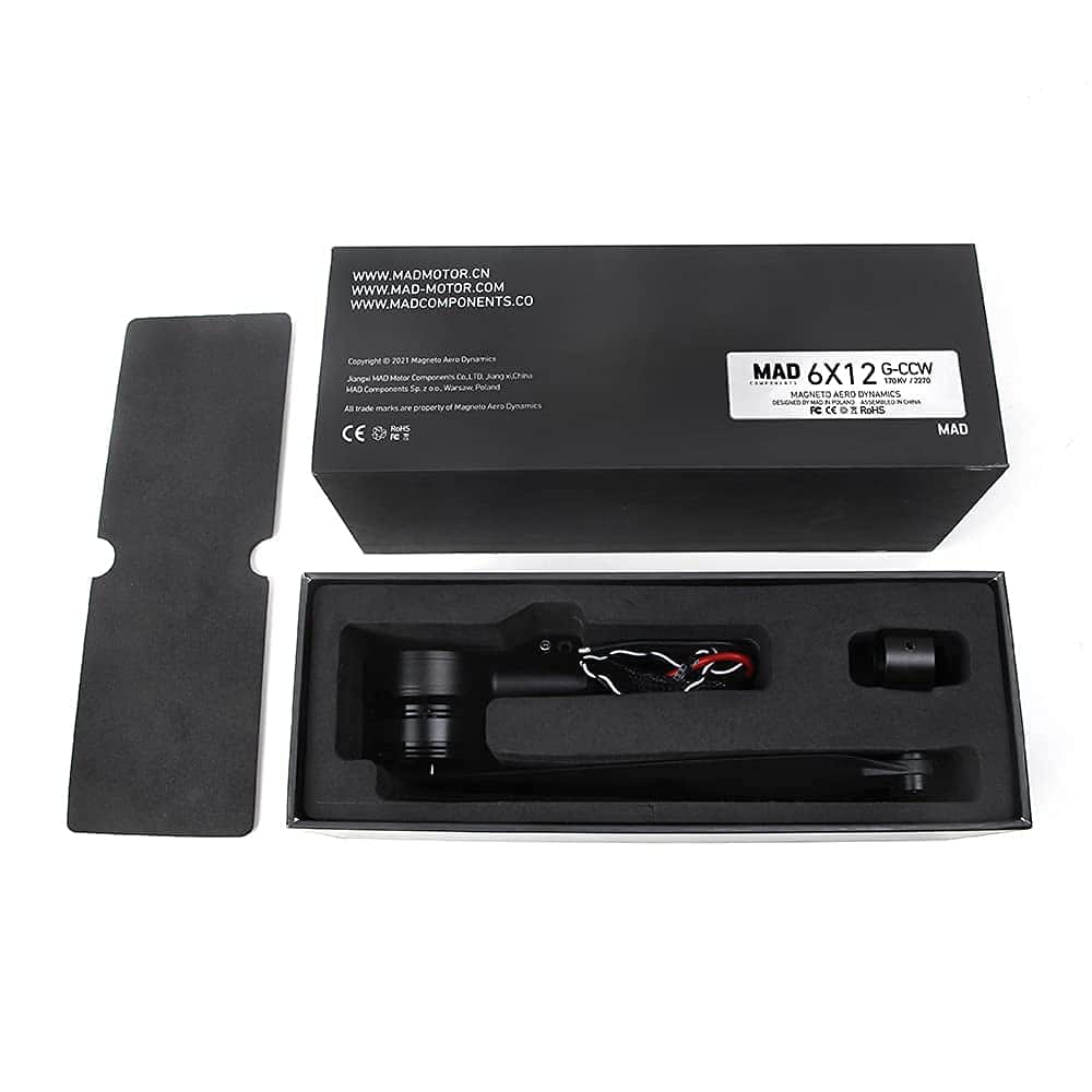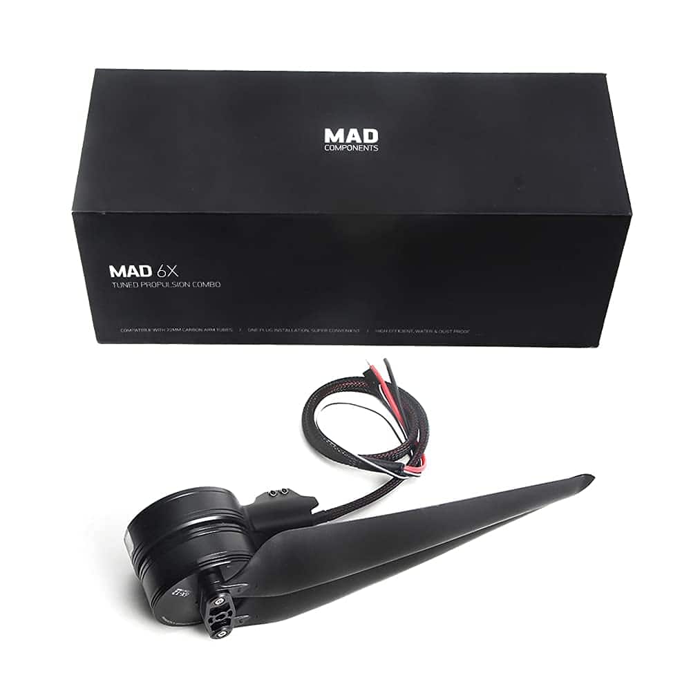 El combo de sistema de energía 6X12 de MAD COMPONENTS está listo para usar en el brazo de drone para obtener un rendimiento máximo, construido para aplicaciones industriales de multirotor, proporcionando 1.1 kg de carga útil por rotor, empuje máximo por rotor 6 kg. El combo solo pesa 505 g. Conjunto de brazo de drone integrado sintonizado motor+esc+hélice, compatible con tubos de brazo de carbono de 30 mm/28 mm/25 mm. Instalación de un solo enchufe, súper conveniente. Eficiente y resistente al agua y al polvo. Ofrecemos CW o CCW, luces LED rojas/verdes para elegir, las configuraciones de rotación del motor y las luces LED se realizarán durante la producción. Opción KV: 150KV/170KV/280KV/400KV.