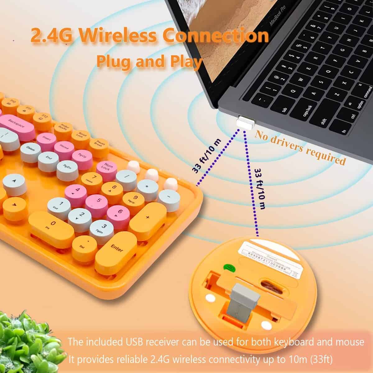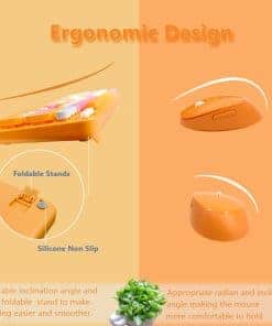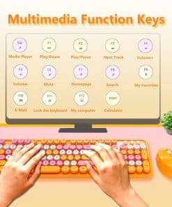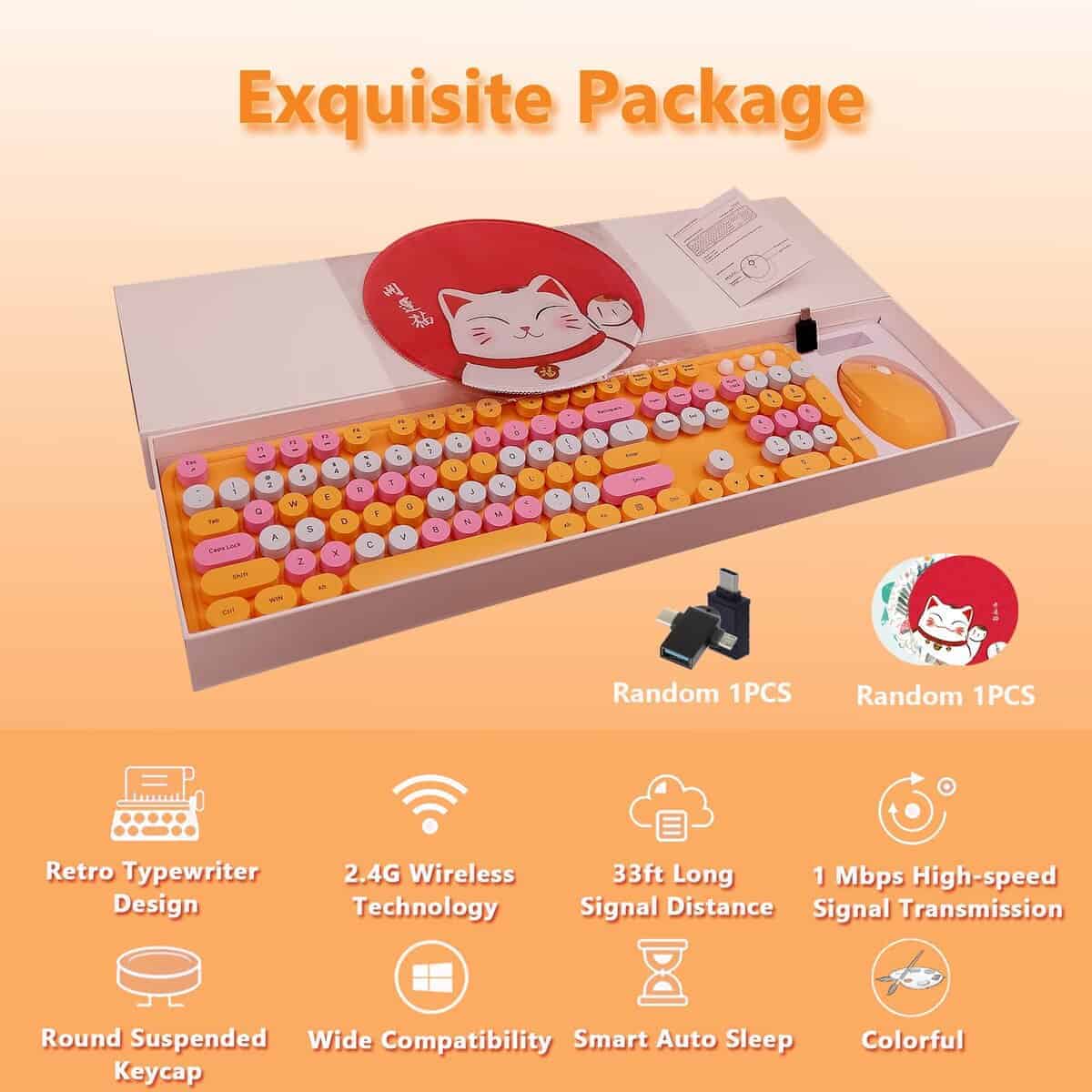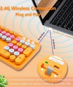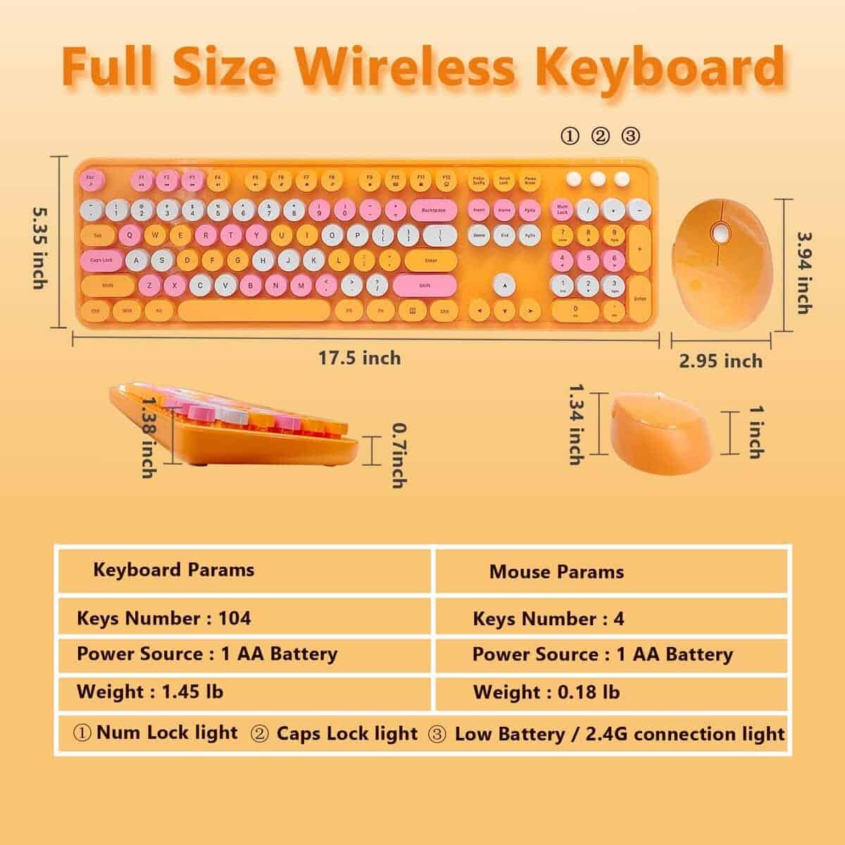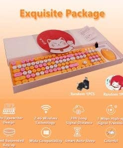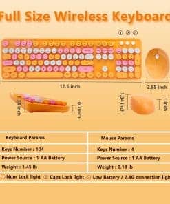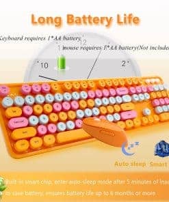 Dulce y Estético Combo de Teclado y Mouse Inalámbricos Es un teclado y mouse externos para laptop Fácil de usar, plug and play con dongle Avanzada tecnología inalámbrica 2.4G provee una conexión fuerte y confiable para este setup de mouse y teclado USB a un rango largo de hasta 10m/33 pies Deshazte de los cables voluminosos para liberar espacio en el escritorio y ofrecerte un nuevo disfrute visual Diseño de colores mezclados, para crear un estilo dulce, para traer una vida única y divertida Diseño Ergonómico La parte inferior del teclado está diseñada con un soporte ajustable, poniendo la muñeca en un ángulo relajado y asegurando la flexibilidad de tus dedos Comodidad y Escritura Silenciosa Teclas altas redondeadas te proporcionan una sensación mecánica Intercambio fácil de teclas, fácil de limpiar Mejorado teclado de membrana, el sonido de las teclas es suave y silencioso 3 indicadores LED Luz de Bloq Num Luz de Bloq Mayús Luz de conexión inalámbrica 2.4G / Luz de Encendido Consejos Cálidos: Cuando el teclado está conectado a tu computadora, la 3ra luz parpadeará Cuando la batería del teclado esté baja, esta 3ra luz también se encenderá para recordarte que reemplaces la batería nueva Diseño a Prueba de Derrames El teclado tiene agujeros de drenaje incorporados, así que no tienes que preocuparte por dañar el teclado si agua salpica en él Ampliamente Utilizado Teclado y mouse kawaii es un adorno bonito en casa o en la oficina, y también será un buen ayudante para tus juegos o trabajo Empaquetado en una caja de regalo, por lo que puede ser un regalo de cumpleaños, Halloween, o Navidad para tu amante o amiga Ordena sin Preocupaciones Todos los teclados y mice son revisados antes del envío.