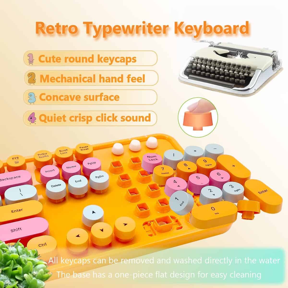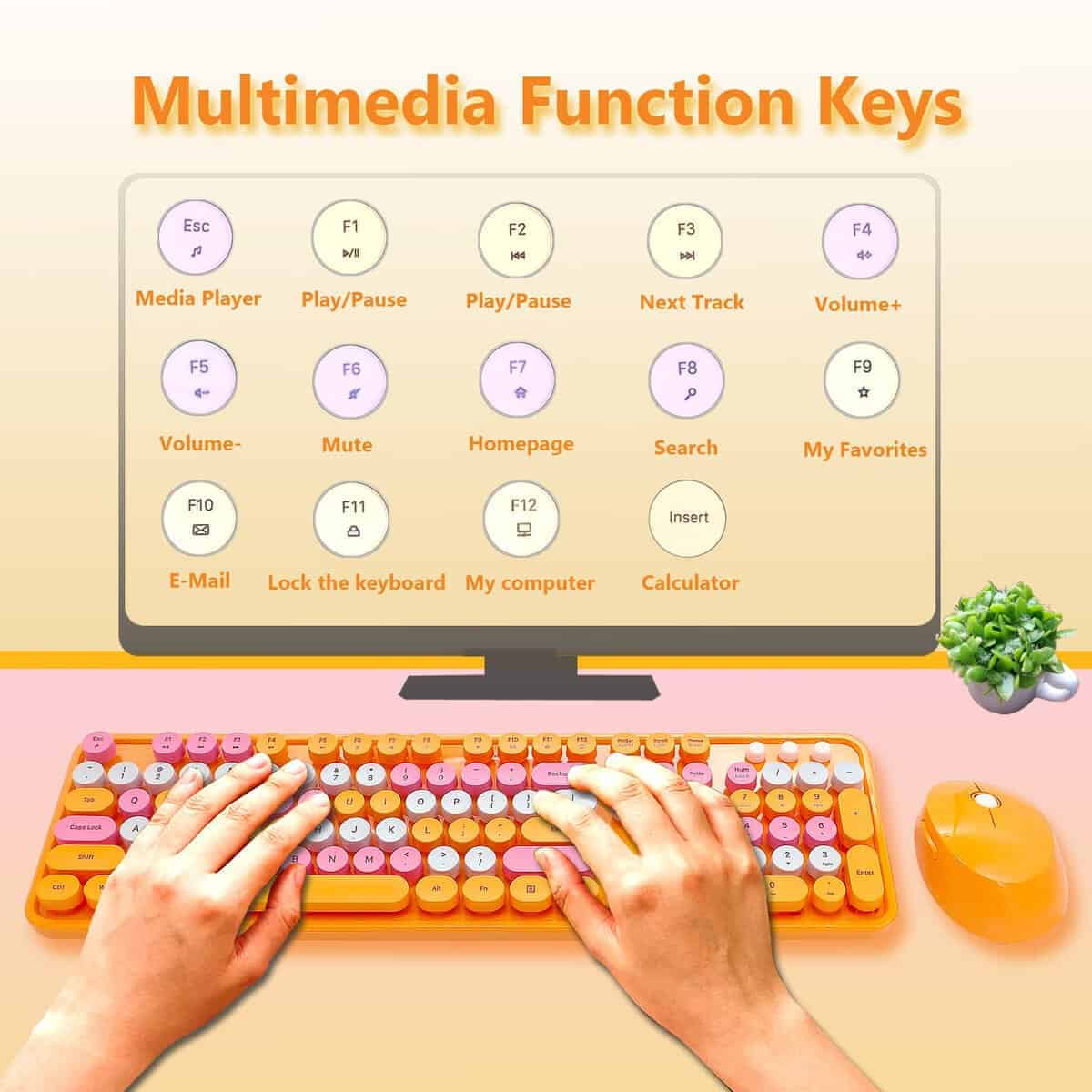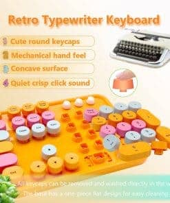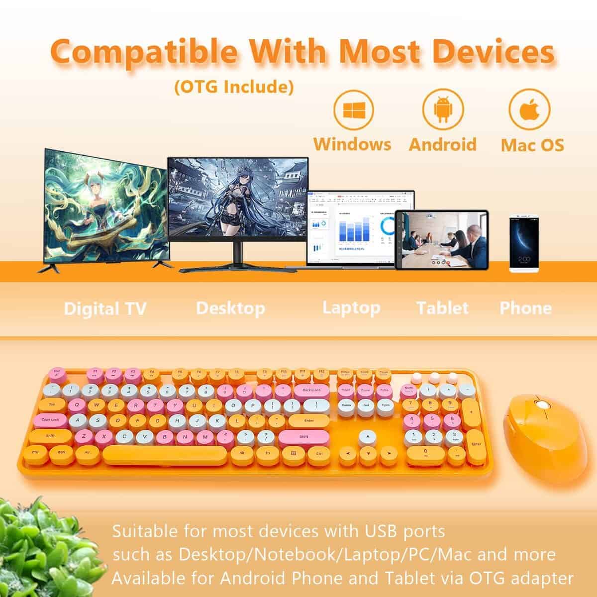 Dulce y Estético Combo de Teclado y Mouse Inalámbricos Es un teclado y mouse externos para laptop Fácil de usar, plug and play con dongle Avanzada tecnología inalámbrica 2.4G provee una conexión fuerte y confiable para este setup de mouse y teclado USB a un rango largo de hasta 10m/33 pies Deshazte de los cables voluminosos para liberar espacio en el escritorio y ofrecerte un nuevo disfrute visual Diseño de colores mezclados, para crear un estilo dulce, para traer una vida única y divertida Diseño Ergonómico La parte inferior del teclado está diseñada con un soporte ajustable, poniendo la muñeca en un ángulo relajado y asegurando la flexibilidad de tus dedos Comodidad y Escritura Silenciosa Teclas altas redondeadas te proporcionan una sensación mecánica Intercambio fácil de teclas, fácil de limpiar Mejorado teclado de membrana, el sonido de las teclas es suave y silencioso 3 indicadores LED Luz de Bloq Num Luz de Bloq Mayús Luz de conexión inalámbrica 2.4G / Luz de Encendido Consejos Cálidos: Cuando el teclado está conectado a tu computadora, la 3ra luz parpadeará Cuando la batería del teclado esté baja, esta 3ra luz también se encenderá para recordarte que reemplaces la batería nueva Diseño a Prueba de Derrames El teclado tiene agujeros de drenaje incorporados, así que no tienes que preocuparte por dañar el teclado si agua salpica en él Ampliamente Utilizado Teclado y mouse kawaii es un adorno bonito en casa o en la oficina, y también será un buen ayudante para tus juegos o trabajo Empaquetado en una caja de regalo, por lo que puede ser un regalo de cumpleaños, Halloween, o Navidad para tu amante o amiga Ordena sin Preocupaciones Todos los teclados y mice son revisados antes del envío.