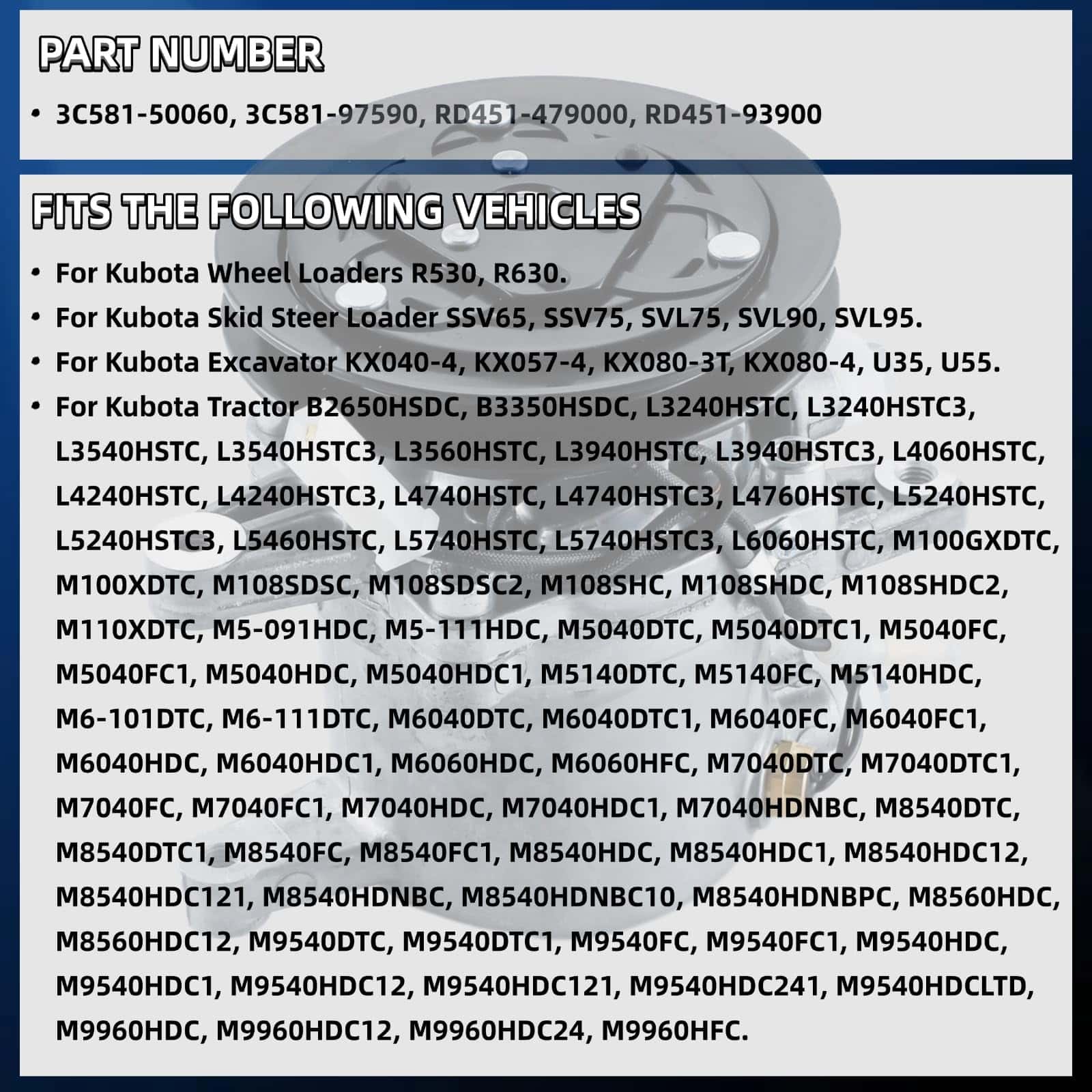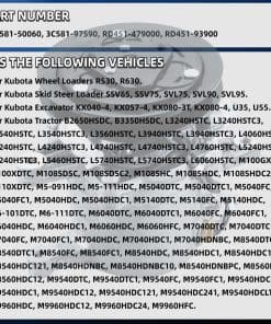 Aplicación de rango de números: Para cargadores de ruedas Kubota R530, R630. Para cargadores de direcciones deslizantes Kubota SSV65, SSV75, SVL75, SVL90, SVL95. Para excavadoras Kubota KX040-4, KX057-4, KX080-3T, KX080-4, U35, U55. Para tractores Kubota B2650HSDC, B3350HSDC, L3240HSTC, L3240HSTC3, L3540HSTC, L3540HSTC3, L3560HSTC, L3940HSTC, L3940HSTC3, L4060HSTC, L4240HSTC, L4240HSTC3, L4740HSTC, L4740HSTC3, L4760HSTC, L5240HSTC, L5240HSTC3, L5460HSTC, L5740HSTC, L5740HSTC3, L6060HSTC, M100GXDTC, M100XDTC, M108SDSC, M108SDSC2, M108SHC, M108SHDC, M108SHDC2, M110XDTC, M5-091HDC, M5-111HDC, M5040DTC, M5040DTC1, M5040FC, M5040FC1, M5040HDC, M5040HDC1, M5140DTC, M5140FC, M5140HDC, M6-101DTC, M6-111DTC, M6040DTC, M6040DTC1, M6040FC, M6040FC1, M6040HDC, M6040HDC1, M6060HDC, M6060HFC, M7040DTC, M7040DTC1, M7040FC, M7040FC1, M7040HDC, M7040HDC1, M7040HDNBC, M8540DTC, M8540DTC1, M8540FC, M8540FC1, M8540HDC, M8540HDC1, M8540HDC12, M8540HDC121, M8540HDNBC, M8540HDNBC10, M8540HDNBPC, M8560HDC, M8560HDC12, M9540DTC, M9540DTC1, M9540FC, M9540FC1, M9540HDC, M9540HDC1, M9540HDC12, M9540HDC121, M9540HDC241, M9540HDCLTD, M9960HDC, M9960HDC12, M9960HDC24, M9960HFC.