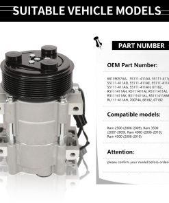 Reemplace el número OE: 55111-411AA, 55111-411AC, 55111-411AD, 55111-411AE, 55111-411AF, 55111-411AG, 55111-411AH, 67182, 68139057AA, R5111411AH, R5111411AI, R5111411AJ, R5111411AK, R5111411AL, R5111411AM, RL111-411AH, 700744, 68182, 67182. Compatible con Ram 2500 2006-2009, Ram 3500 2007-2009, Ram 4000 2006-2010, Ram 4500 5500 2008-2010, 5.9L 6.7L, solo diésel. Componentes del paquete: 1 compresor de A/C con embrague. Servicio: Si tiene alguna pregunta después de comprar los productos, le daremos una respuesta satisfactoria en 24 horas.