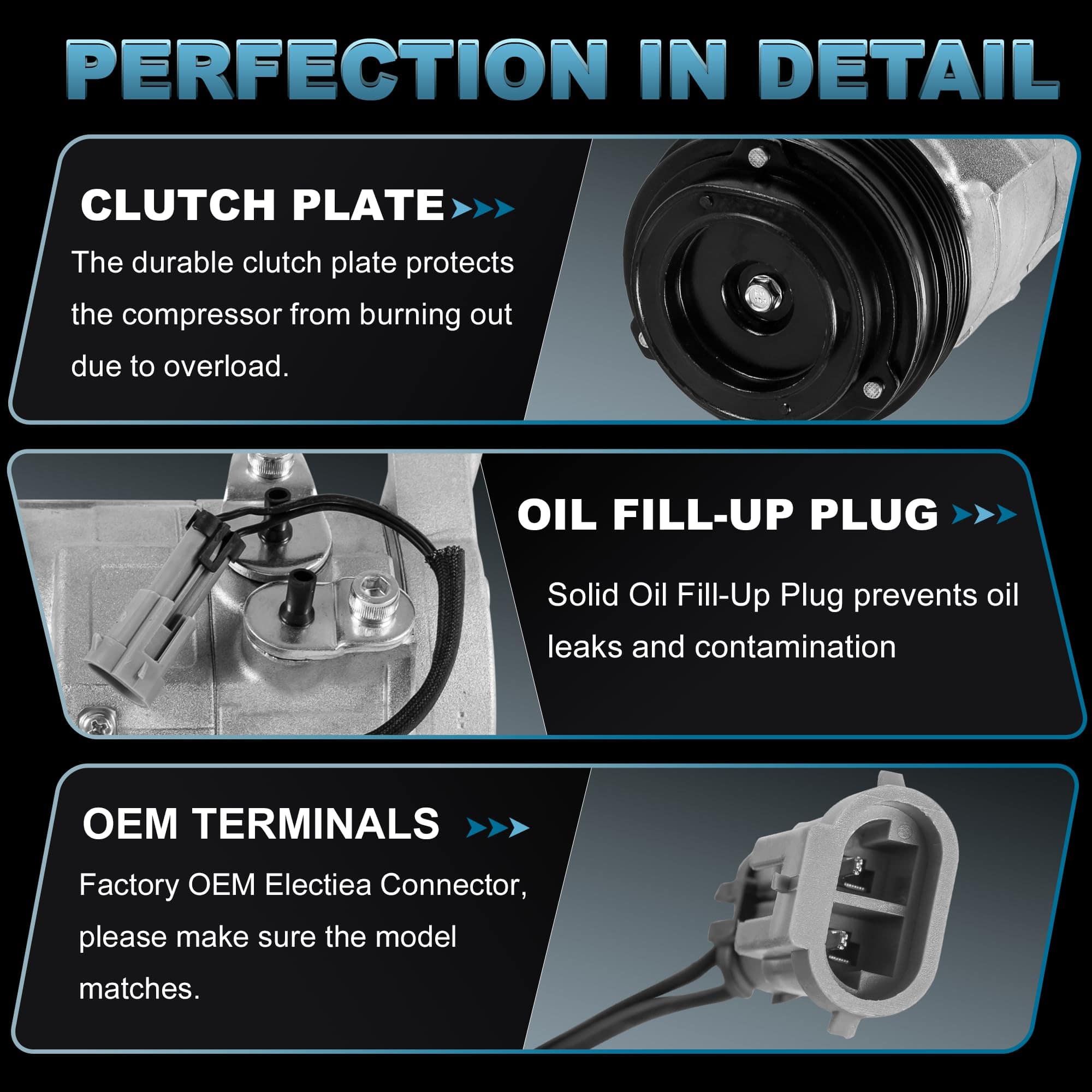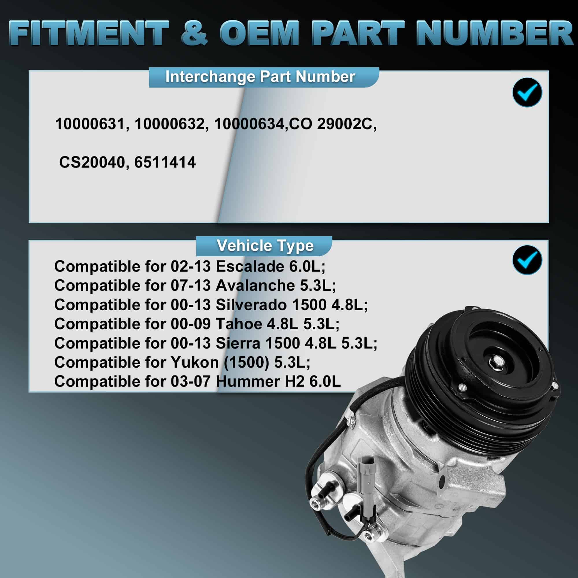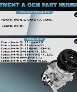 1. Ajuste del Compresor de A/A: Compatible para 02-13 Escalade 6.0L; Compatible para 07-13 Avalanche 5.3L; Compatible para 00-13 Silverado 1500 4.8L; Compatible para 00-09 Tahoe 4.8L 5.3L; Compatible para 00-13 Sierra 1500 4.8L 5.3L; Compatible para Yukon (1500) 5.3L; Compatible para 03-07 Hummer H2 6.0L.