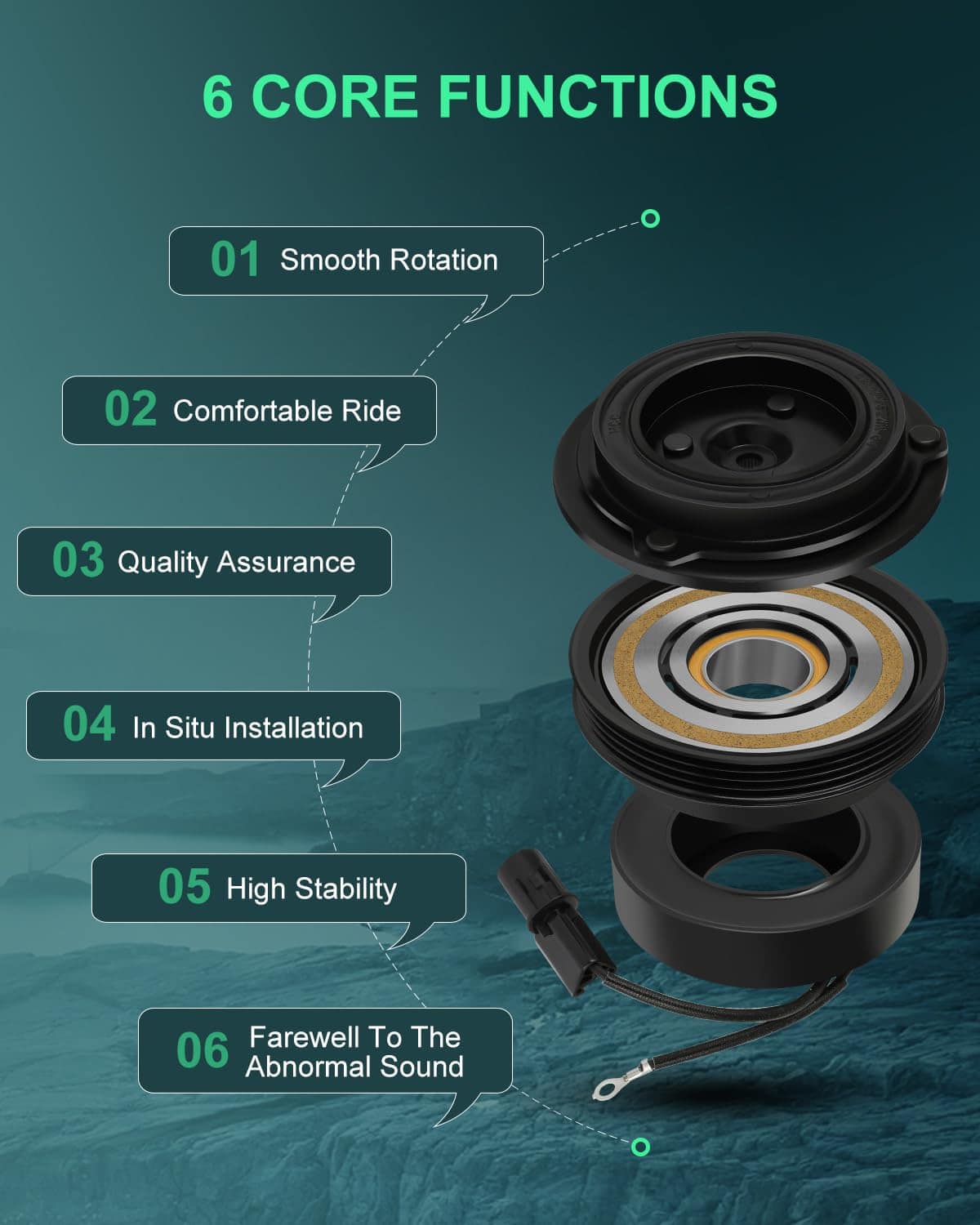 1. Ajuste del embrague del compresor de aire acondicionado: 2005-2009 Compatible con Hyundai Tucson 2.0L;2004 Compatible con Kia Spectra 1.8L;2004-2006 Compatible con Kia Spectra 2.0L;2005-2006 Compatible con Kia Spectra5 2.0L;2005-2010 Compatible con Kia Sportage 2.0L.