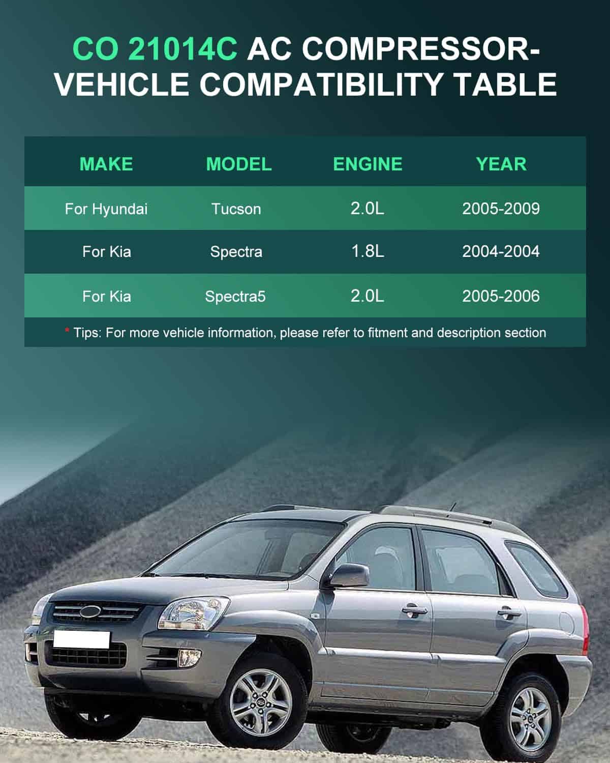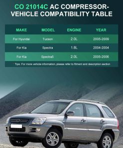 Compresor de aire acondicionado con embrague SCITOO, ¡100% nuevo y de alta calidad! Este compresor es compatible con varios modelos de vehículos, incluidos Hyundai Tucson y Kia Spectra. Tiene un embrague de repuesto y ha sido totalmente reconstruido y probado para garantizar un rendimiento óptimo. Recuerde limpiar la tubería del sistema de enfriamiento de su automóvil antes de la instalación para evitar daños en el sistema. ¡Asegúrese de comprobar la descripción detallada para garantizar el ajuste perfecto de este compresor de aire acondicionado en su vehículo!
