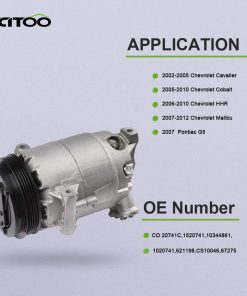 SCITOO Nuevo Compresor de A/C y Embrague encaja en: 2002-2005 Chevrolet Cavalier 2.2L 2008-2010 Chevrolet Cobalt 2.0L 2005-2007 Chevrolet Cobalt 2.2L 2006-2007 Chevrolet Cobalt 2.4L 2008-2010 Chevrolet HHR 2.0L 2006-2007 Chevrolet HHR 2.2L 2006-2007 Chevrolet HHR 2.4L 2007-2008 Chevrolet Malibu 2.2L 2008-2012 Chevrolet Malibu 2.4L 2007-2007 Pontiac G5 2.2L 2007-2007 Pontiac G5 2.4L 2007-2010 Pontiac G6 2.4L 2005-2006 Pontiac Pursuit 2.2L 2006-2006 Pontiac Pursuit 2.4L 2002-2005 Pontiac Sunfire 2.2L 2002-2002 Pontiac Sunfire 2.4L 2008-2009 Saturn Aura 2.4L 2003-2005 Saturn Ion 2.2L Paquete Incluido: 1 Compresor de A/C con Embrague Características: Bushings incluidos para una instalación completa, ahorrando tiempo y mano de obra. Reemplazo directo para una instalación sin problemas. Construcción de acero, hierro o aluminio garantiza durabilidad. Recubierto de pintura en polvo o pintado para una resistencia duradera a la corrosión.