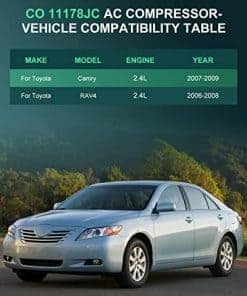 Marca SCITOO Compresor de Aire Acondicionado y Embrague Nuevo para: Toyota Camry 2.4L 2007-2009 (1er Diseño); Toyota RAV4 2.4L 2006-2008. El paquete incluye: 1 compresor, 1 embrague. Incluye bujes para una instalación completa, garantizando durabilidad. Reemplazo directo para una instalación sin problemas. Construcción en acero, hierro o aluminio para mayor durabilidad. Recubierto en polvo o pintado para resistencia a la oxidación y la corrosión.