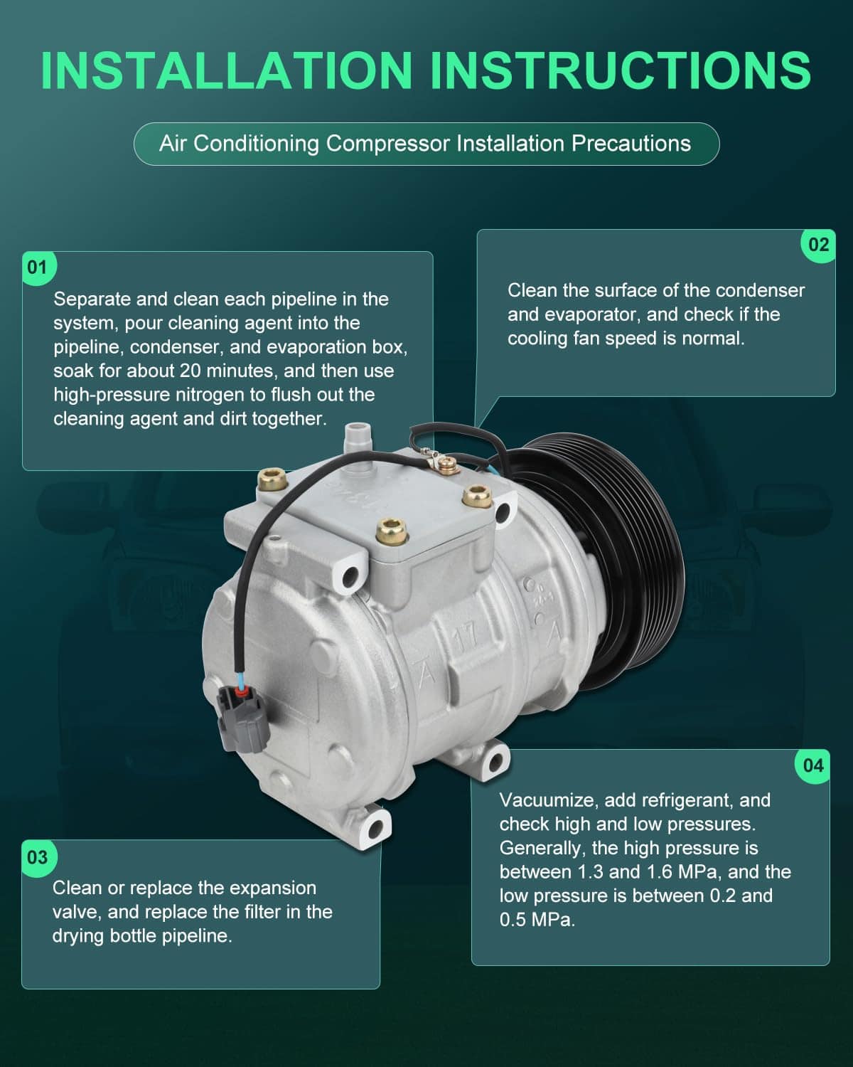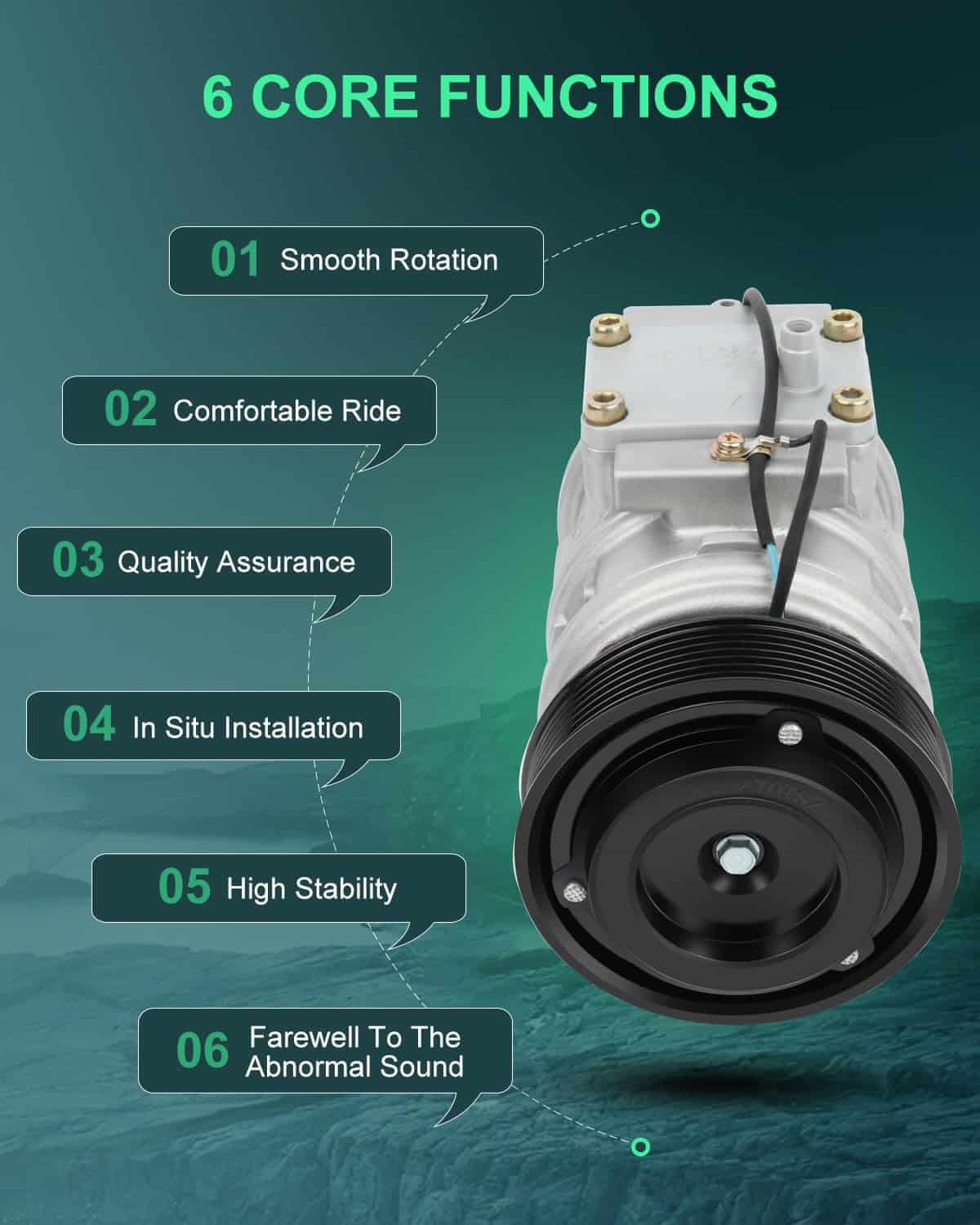 3. Ventajas: Los compresores son el corazón del sistema de aire acondicionado, por lo que cada compresor de aire acondicionado SCITOO se somete a una variedad de pruebas de rendimiento y ciclo de vida. 100% Nuevo y de Alta Calidad, Totalmente reacondicionado y probado en unidad OEM de calidad premium ISO/TS 16949.