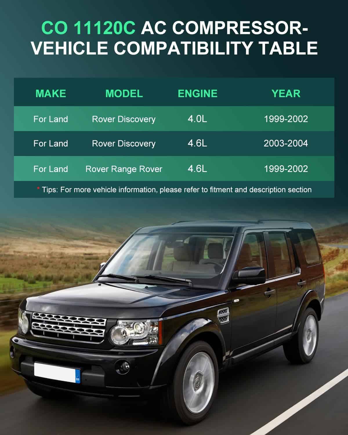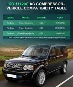 1. Adaptación del Compresor de Aire Acondicionado: 1999-2002 Adaptar para Land Rover Discovery 4.0L; 2003-2004 Adaptar para Land Rover Discovery 4.6L; 1999-2000 Adaptar para Range Rover 4.0L; 2003 Adaptar para Range Rover 4.4L; 1999-2002 Adaptar para Range Rover 4.6L;.