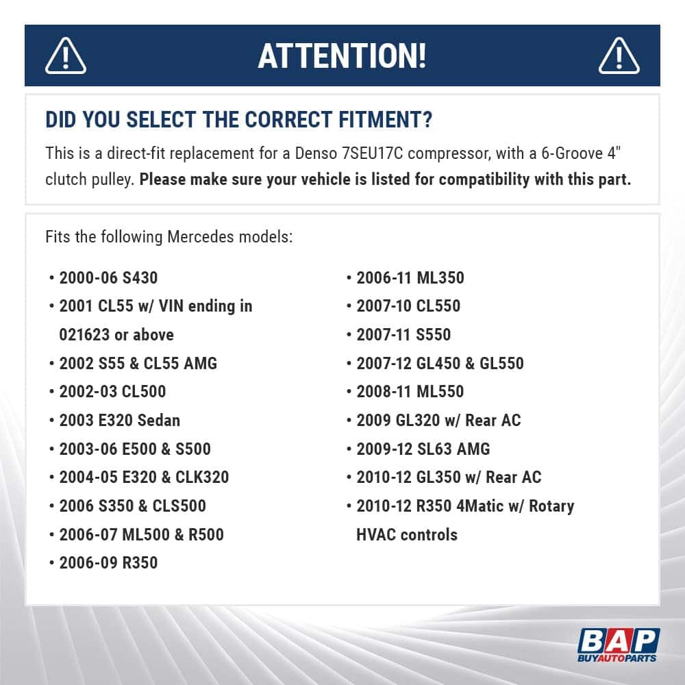 5. Este es un reemplazo directo para el compresor 7SEU17C con polea de embrague serpentín de 4″, presente en muchos modelos Mercedes de EE.UU. de la década de 2000. Consulte la infografía de ajuste en las imágenes y verifique el número de parte en su compresor original para asegurarse de que está realizando el pedido para el vehículo correcto.