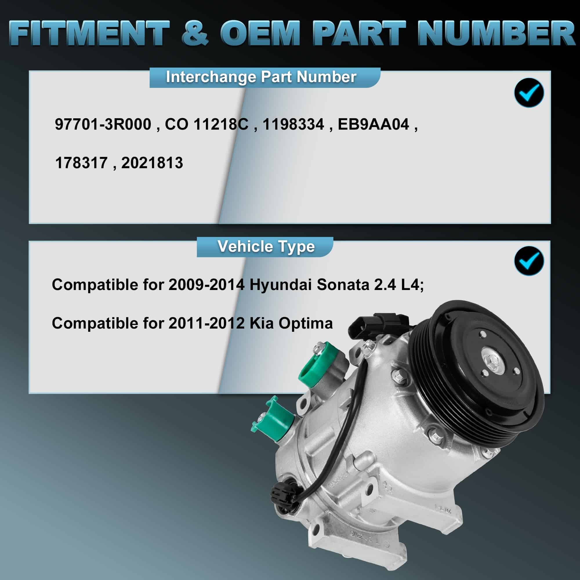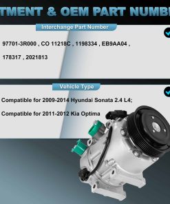 1. Ajuste compatible para Hyundai Sonata 2.4 L4 2009-2014; Compatible para Kia Optima 2011-2012.