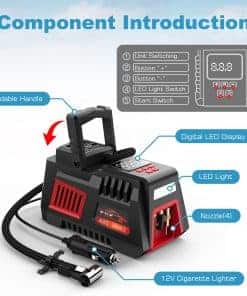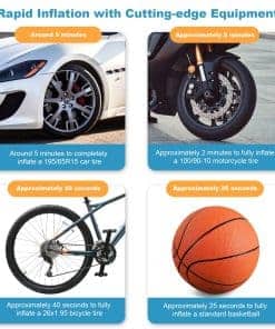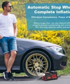 Compresor de aire digital portátil de 12V DC diseñado para inflar llantas de automóvil con facilidad y rapidez. Con una presión máxima de 150 PSI y flujo de aire de 35L/min, puede inflar una llanta de automóvil 195/65R15 de 0 a 35psi en menos de 5 minutos. Cuenta con pantalla digital de alta precisión, función de inflado programable y luz LED de larga duración para uso en la oscuridad. Equipado con 4 boquillas y un fusible adicional, el compresor es versátil y fácil de usar para una variedad de productos. Incluye un cable de alimentación ultra largo de 10.83 pies para facilitar el acceso a las llantas delanteras y traseras, y su tamaño compacto permite un almacenamiento conveniente en el vehículo. ¡Mantén tus llantas en óptimas condiciones con este práctico compresor de aire portátil!