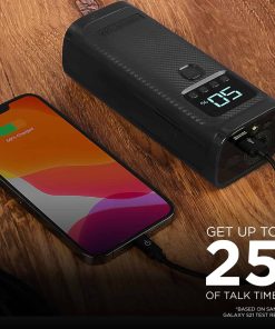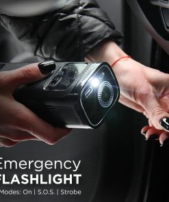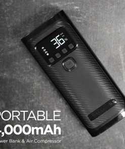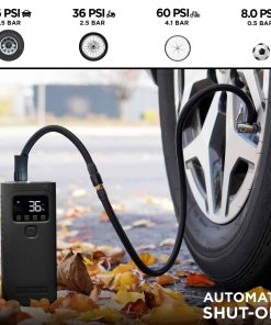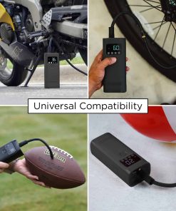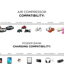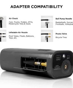 Compresor de aire portátil con 150 PSI de potencia que puede inflar neumáticos de vehículos, neumáticos de bicicleta, pelotas, flotadores de piscina y mucho más! Incluye un banco de energía de 4,000mAh con puerto de carga USB para dispositivos como teléfonos, tabletas, altavoces, sistemas de juegos, y más. Linterna incorporada con tres modos: Encendido, S.O.S. y Estroboscópico. Fácil de usar con medidor de presión digital y nivel de batería. Incluye adaptadores para neumáticos, pelotas e inflables.