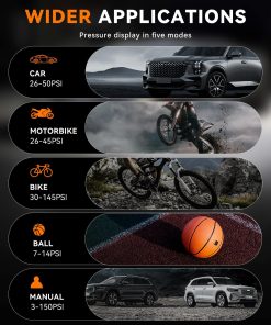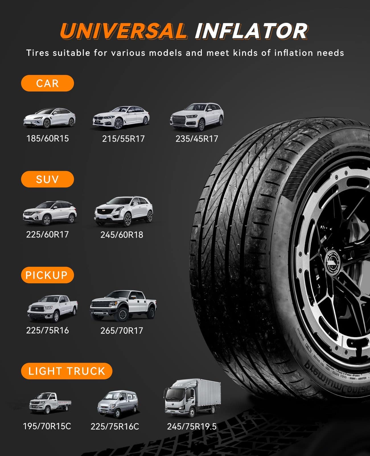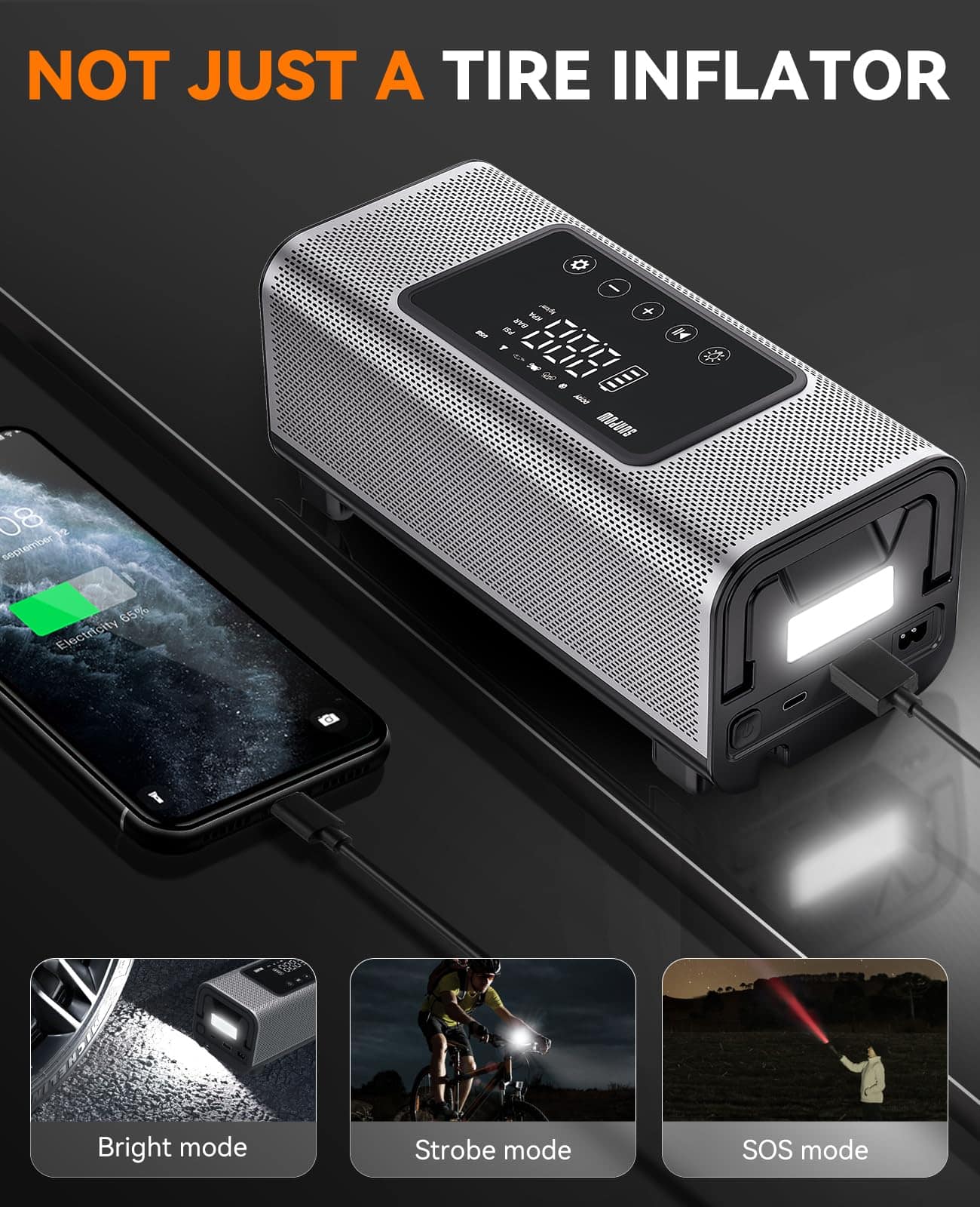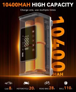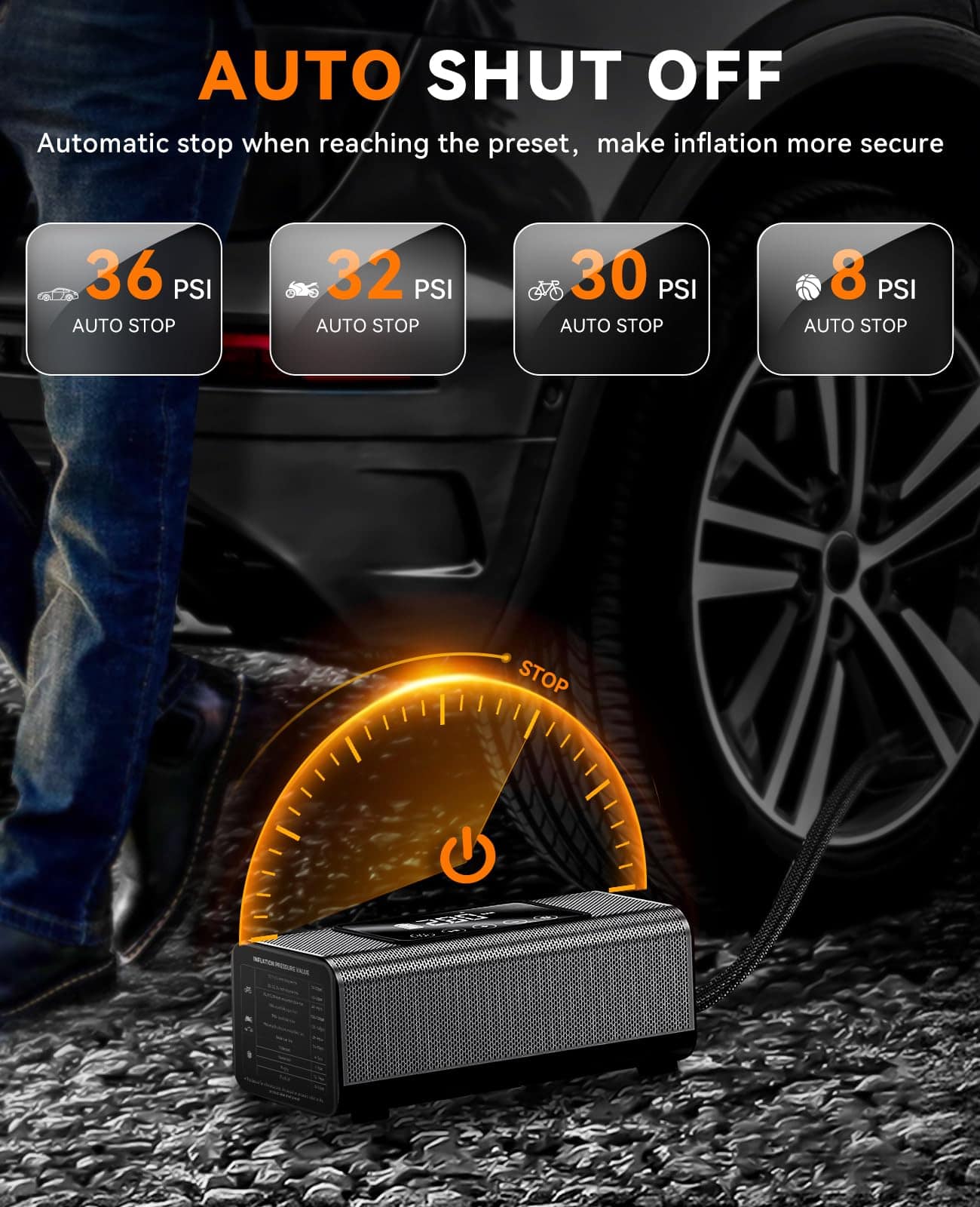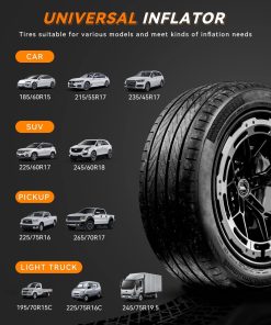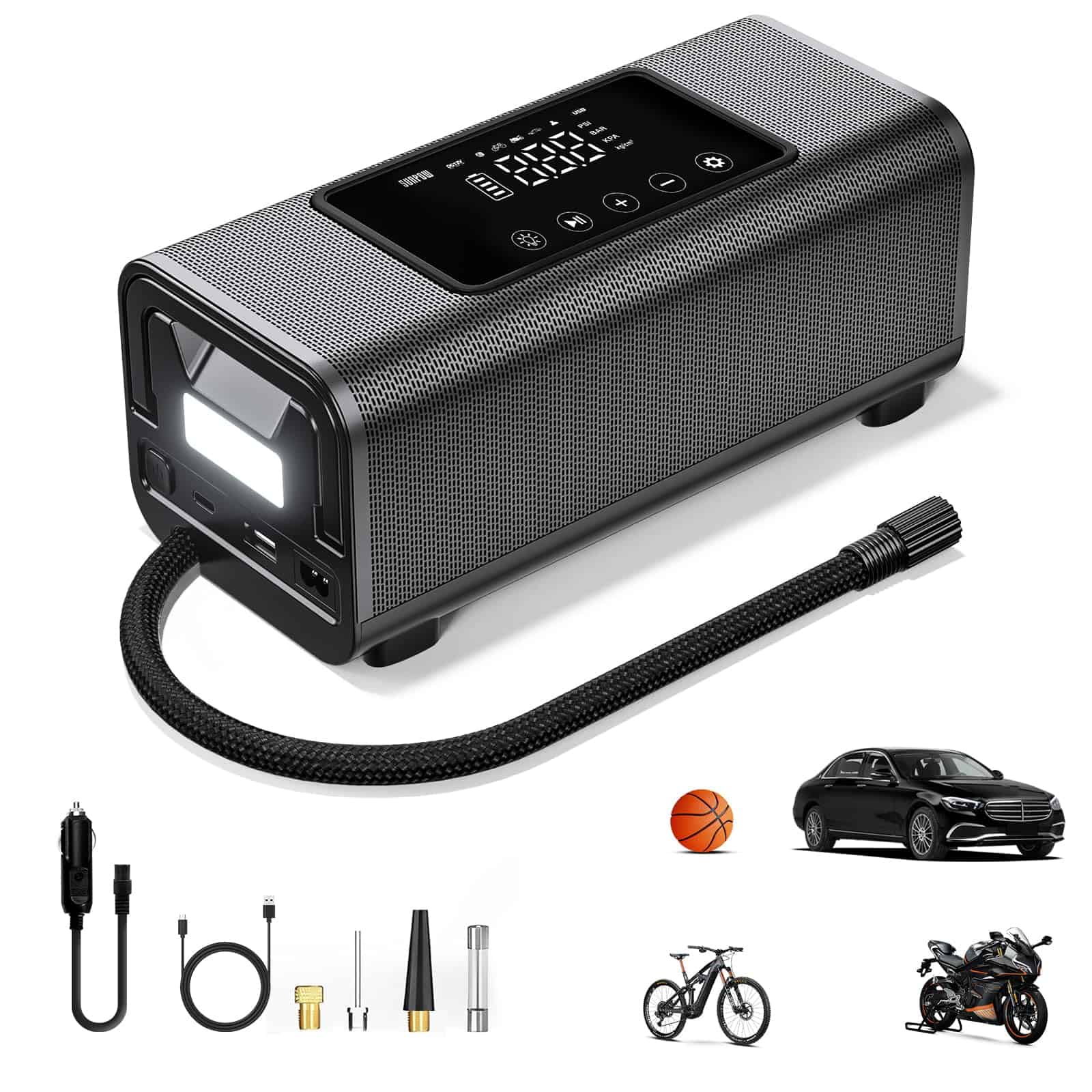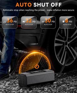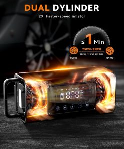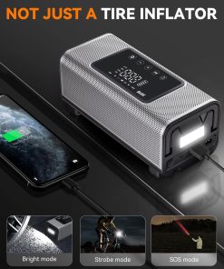 El compresor de aire portátil SUNPOW cuenta con un diseño de doble cilindro de alto rendimiento, que puede proporcionar hasta 150 PSI de presión, e inflar neumáticos de coche 195/65/R15 de 24 psi a 36 psi en solo un minuto. 2 veces más rápido que los neumáticos tradicionales, rápido de inflar, ahorro de tiempo y conveniente, adecuado para varios modelos, incluyendo coches, SUVs, pickups, motocicletas y bicicletas. Este inflador de neumáticos para coches tiene una batería recargable integrada de 4 2600mAh, que puede cargar fácilmente 6 neumáticos en una sola carga. También viene con un cable de encendedor de 10 pulgadas, proporcionándole una vida útil de la batería duradera para asegurarse de que esté siempre disponible cuando lo necesite. El compresor de aire para coche cuenta con una pantalla táctil LED de alta definición, este inflador de neumáticos muestra valores de presión en tiempo real y preestablecidos para una lectura fácil. Su operación con un solo toque le permite establecer la presión deseada. La función de apagado automático evita la sobreflación una vez que se alcanza la presión preestablecida, garantizando la seguridad de los neumáticos. La manguera de inflado de 50CM incorporada mejora la resistencia al calor para una inflación de neumáticos más segura. Además de una inflación eficiente, el inflador de aire multifuncional cuenta con puertos de carga USB Tipo-C y 5V/2A para una carga conveniente de dispositivos móviles. Con tres modos de iluminación de la luz LED integrada, es una herramienta crucial en entornos oscuros. La manija oculta y el tamaño portátil garantizan un transporte fácil en cualquier momento y en cualquier lugar. Cada producto SUNPOW se basa en una excelente calidad, después de una estricta inspección de calidad, un servicio al cliente superior para cada cliente para brindar una experiencia extraordinaria de compra, ¡no dude en comprar!