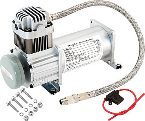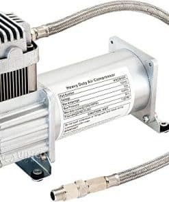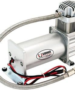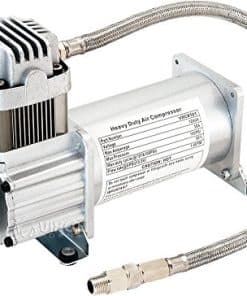 Este compresor de aire pesado y libre de mantenimiento, con capacidad de 150 PSI, está diseñado para ser utilizado con cualquier sistema de aire a bordo de alta presión u otras aplicaciones que requieran suministro de aire a presión. Diseñado para trabajar con tanques de aire de hasta 5 galones. La unidad viene con una manguera trenzada estándar de acero inoxidable de » con válvula de retención en línea de » NPT, fusible y hardware de montaje. Ideal para todos los vehículos con sistema de 12V. Compresor de aire de 150 PSI Motor magnético permanente de 12V Presión máxima de trabajo: 150 PSI Ciclo de trabajo: 50% @ 100 PSI Consumo de amperaje: 30A Tasa de flujo: 1.4 CFM @ 0 PSI Diseño sin aceite Resistente a la humedad y al polvo Cilindro de aleación de aluminio anodizado Protector térmico de sobrecarga con reinicio automático Placas de montaje con aisladores de vibración Manguera principal de » NPT trenzada de acero inoxidable Ensamblaje del filtro de admisión Cableado aislado con conectores Fusible de 30A en línea con portafusibles a prueba de agua Hardware de montaje incluido Dimensiones: 9- » L x 4″ An x 6- » A