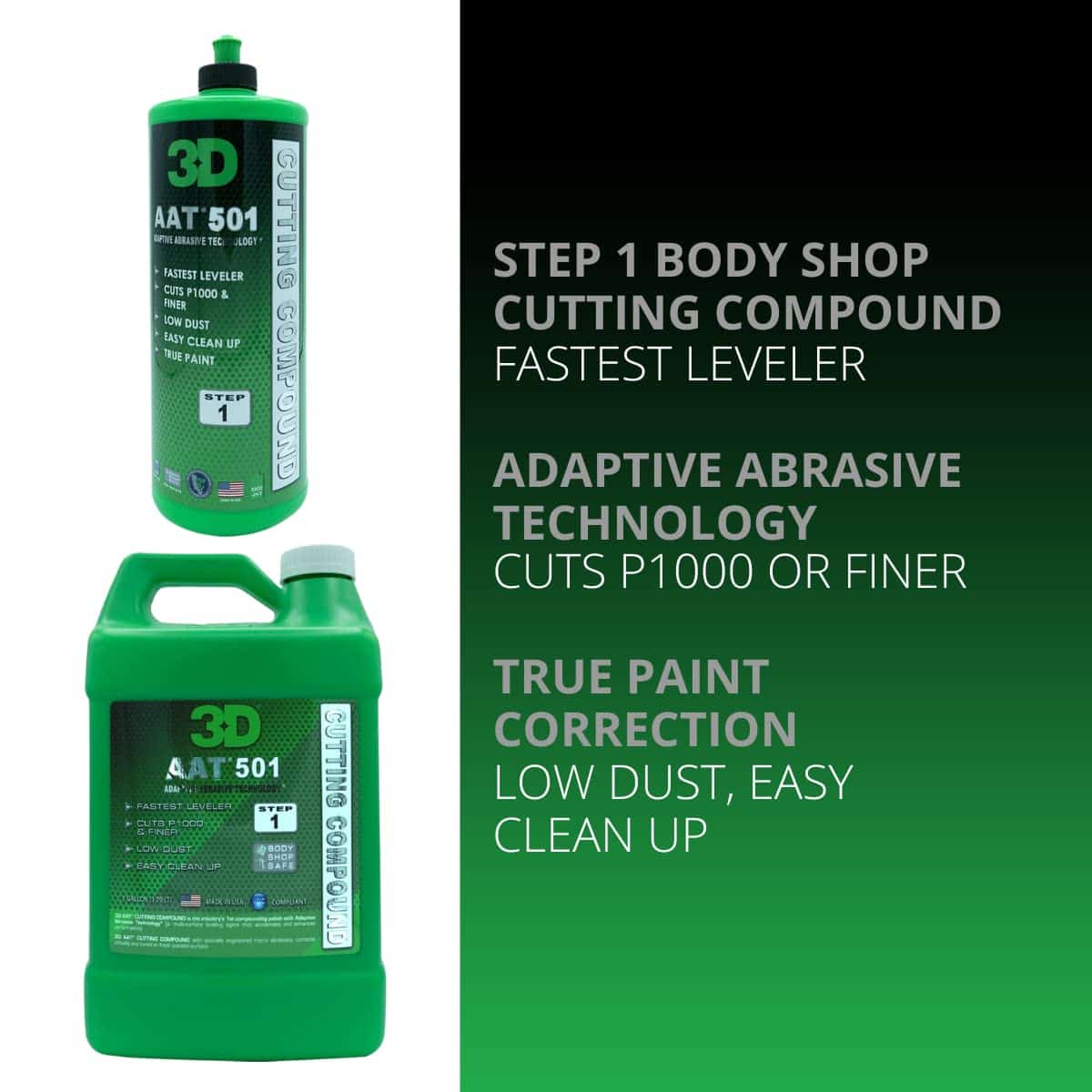 El Compuesto de Corte de 3D con Tecnología Abrasiva Adaptativa es el primer pulimento de compuesto en la industria con esta característica (un agente nivelador de múltiples superficies que acelera y mejora el rendimiento). El Compuesto de Corte de 3D con microabrasivos especialmente diseñados corrige prácticamente cualquier superficie pintada curada o fresca.