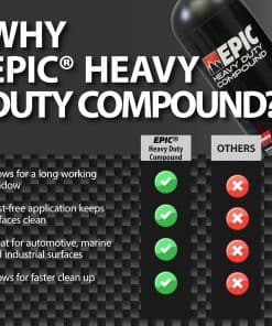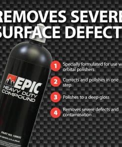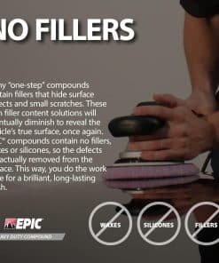 3. COMPUESTO DE COCHE LIBRE DE POLVO Y SIN REMOLINOS: El Compuesto EPIC de Alta Resistencia ofrece una aplicación libre de polvo, manteniendo su espacio de trabajo limpio y eficiente. Ofrece un acabado sin remolinos cuando se usa con la almohadilla orbital correcta, como la Almohadilla de Lana Púrpura de Alta Resistencia Epic o la Almohadilla de Espuma Gris de Alta Resistencia EPIC. Este compuesto para pulir coches garantiza que la pintura de su vehículo permanezca suave y brillante sin marcas de remolino antiestéticas, ofreciendo un resultado de grado profesional en todo momento.