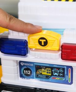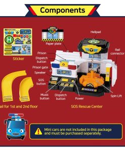Este set de juego para niños está basado en la popular serie de televisión ‘Tayo the Little Bus. Utilizando mini personajes de autos de la serie de televisión, cuenta con varios dispositivos que permiten a los niños crear sus propias historias. Con diversos mini autos para la policía, bomberos y rescate, 23 diferentes sonidos acompañan cada acción para mayor diversión. La edad recomendada para jugar con este set es de 37 meses en adelante. No incluye los mini autos, los cuales deben comprarse por separado. La caja mide 40x21x28 cm y está hecha de material ABS. Viene con la Estación de Rescate SOS Tayo, rieles del primer y segundo piso, y calcomanías. Es importante mencionar que se requieren 3 pilas AAA, las cuales no están incluidas y deben comprarse por separado. Este set de rescate es compatible con otros sets de juego de Tayo. Algunas partes del set, como la ‘Prisión Secreta’ y el ‘Ascensor Giratorio’, tienen partes móviles por lo que se recomienda la supervisión de un adulto para un uso seguro por parte del niño.