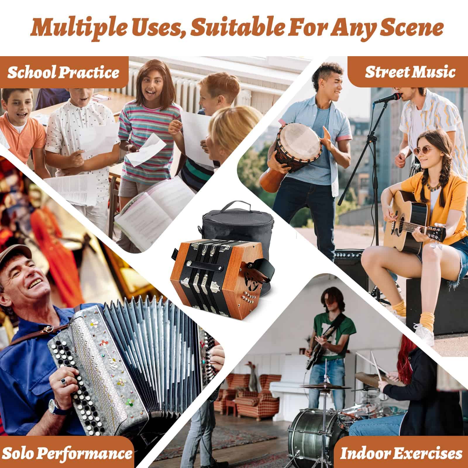 3. TECLAS CÓMODAS Y SENSIBLES: Las 20 teclas de este acordeón están diseñadas específicamente para ser flexibles y fáciles de presionar. Proporcionan una operación simple y cómoda, permitiéndote tocar tus melodías favoritas con precisión y sensibilidad.