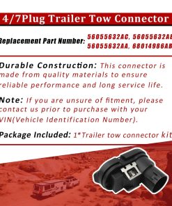 Conector de Enchufe para Remolque de 7 Vías Compatible con 2011-2022 Dodge Durango Grand Cherokee. Este conector de remolque es una pieza de repuesto de alta calidad que reemplaza los números de pieza 56055632AC, 56055632AB, 56055632AA, 68014986AB. Fabricado con materiales duraderos para garantizar un rendimiento fiable y una larga vida útil. Si tiene dudas sobre la compatibilidad, comuníquese con nosotros antes de la compra con su VIN. El paquete incluye 1 conector para remolque.