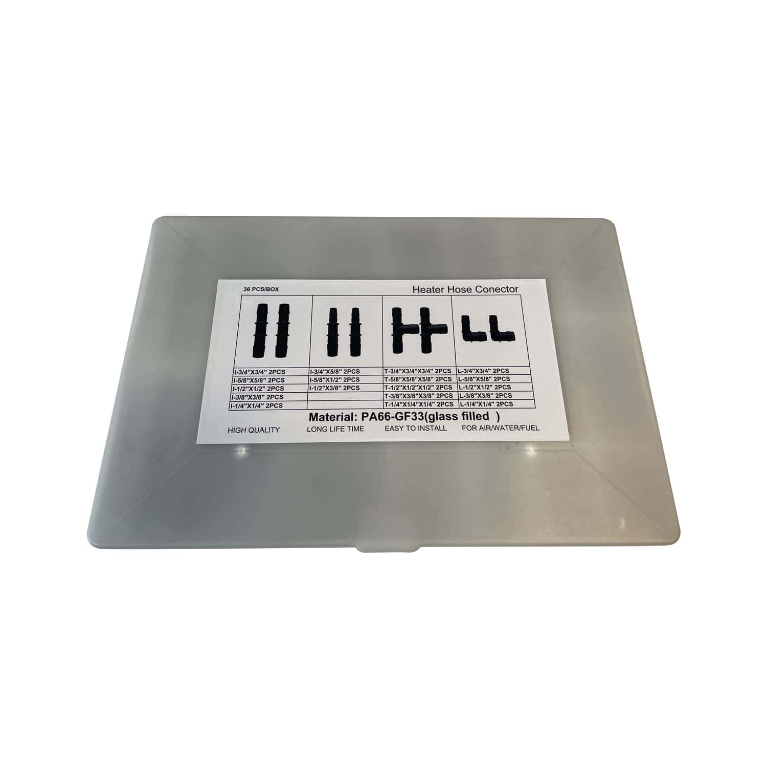 Tamaño perfecto: Los kits de conectores de manguera de calefacción KDP contienen cuatro formas de conectores de manguera de calefacción: recto, codo, «T» y reductor. Material de ventaja: el conector de manguera de calefacción está hecho de nylon PA66 G35 de alta calidad. Hace que nuestro conector de manguera de calefacción sea más duro, más duradero y más resistente a temperaturas más altas en comparación con los accesorios de barrera de nylon PP o PE normales. Y el accesorio de Nylon PA66 es mucho más liviano que el accesorio de latón y los conectores de acero. Resistencia a altas temperaturas: -40 ° F a +257 ° F (-40 ° C a +125 ° C) Presión máxima: 150 libras por pulgada cuadrada Diseño perfecto: los conectores de manguera de calefacción KDP y de línea de combustible utilizan un diseño único de una sola barra para proporcionar una mayor sellabilidad entre las mangueras de diámetro interior único o doble. Disponibles en formas rectas, codos de 90 grados y en forma de T; casi cualquier configuración de manguera puede ser construida. Aplicaciones: Los conectores de manguera de calefacción son universales y ampliamente utilizados para los conectores de la línea de vacío y la manguera de calefacción de goma en el compartimento del motor, también pueden usarse como conectores de manguera de refrigerante Económico: en comparación con otros tipos de accesorios, el conector de manguera de calefacción KDP se considera más económico con opciones de componentes del sistema de alto valor.