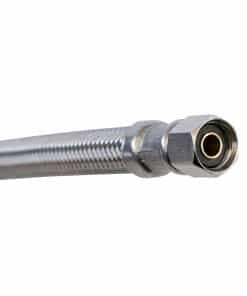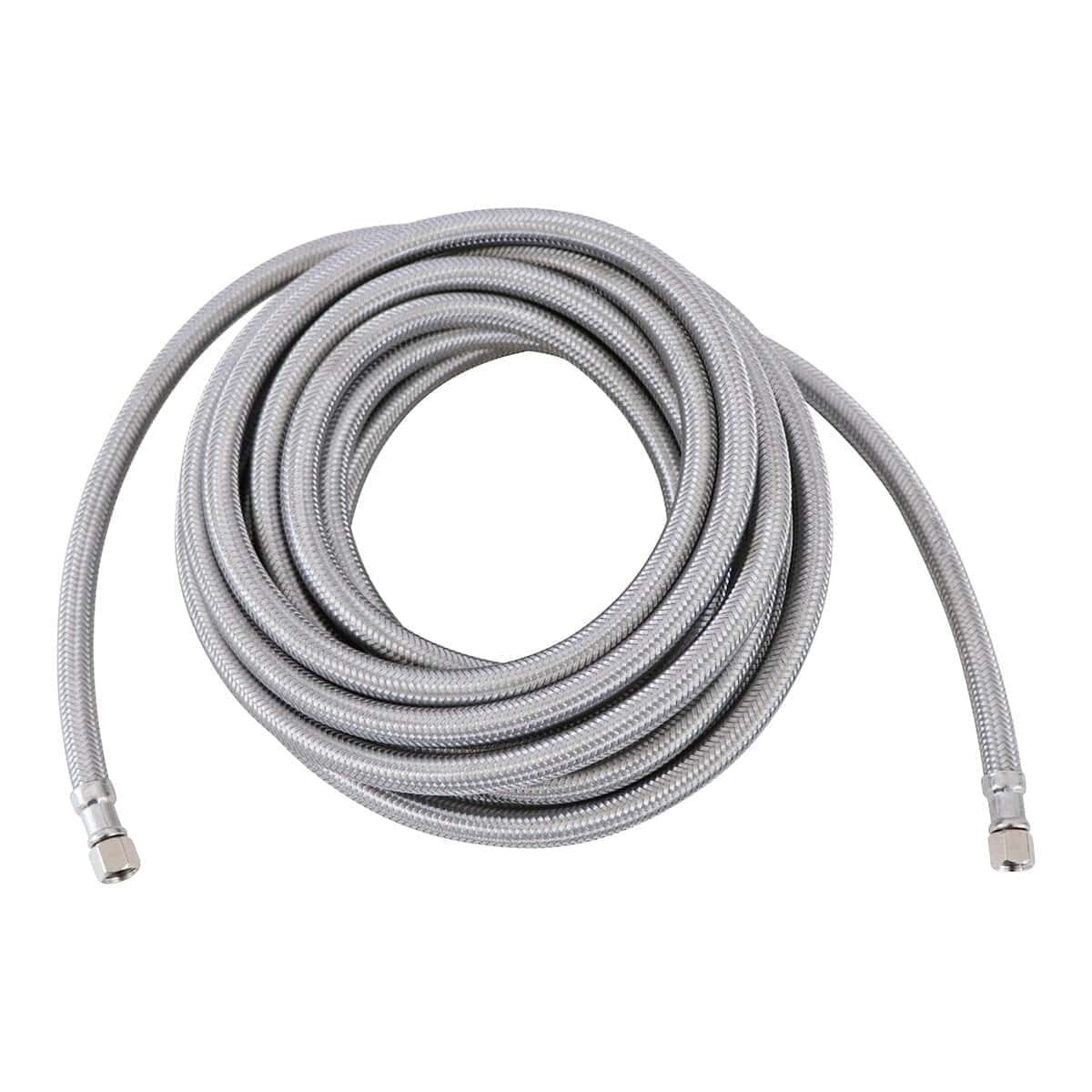 2. 20 PIES DE LONGITUD con conectores de compresión de entrada y salida de 1/4 x 1/4 pulgadas. La manguera de acero inoxidable es significativamente mejor que la de plástico. El plástico es vulnerable a rasgaduras, roturas y fugas, y una manguera de plástico defectuosa puede llevar a una reparación costosa y que consume tiempo. El acero inoxidable mantiene el agua y el hielo con un sabor fresco y limpio.