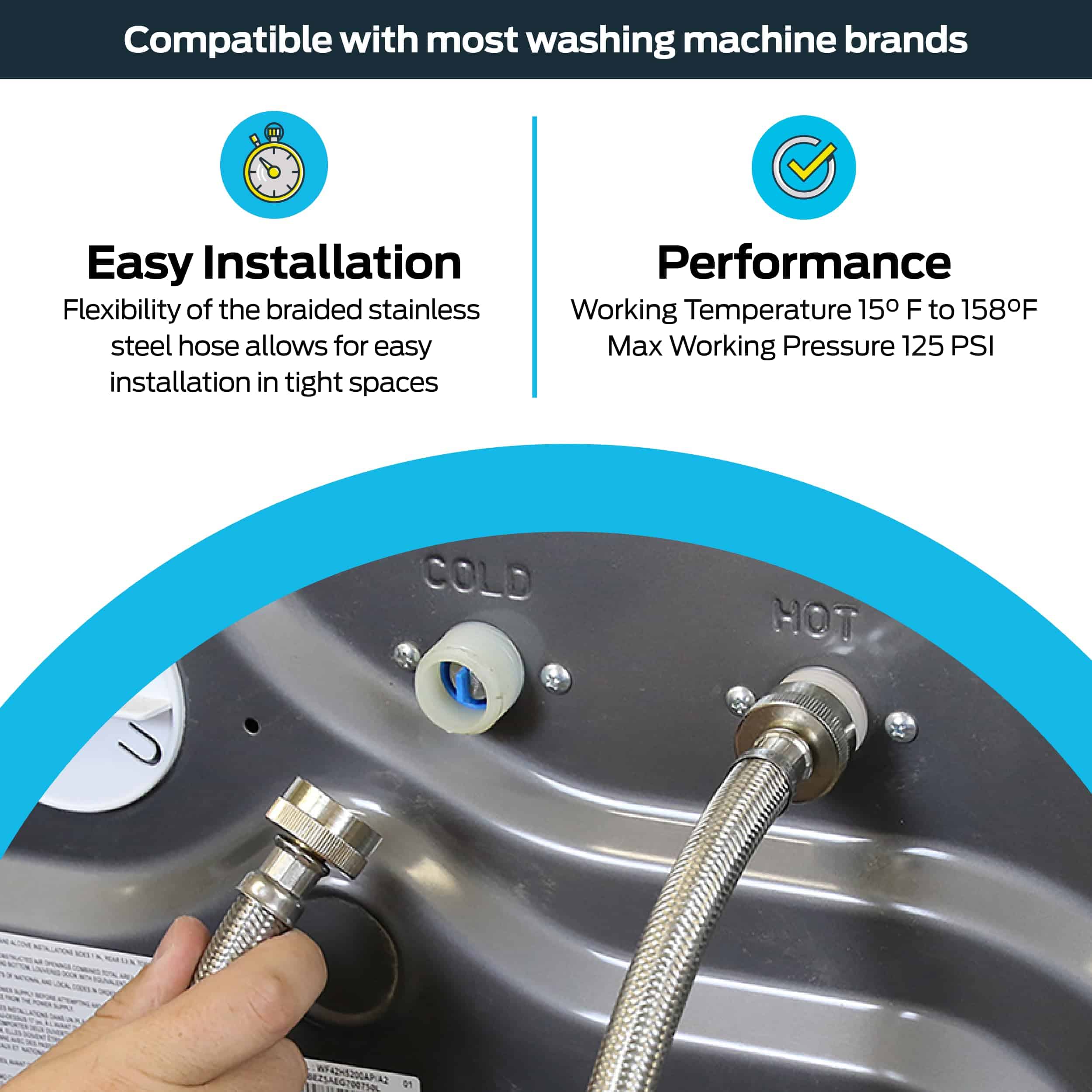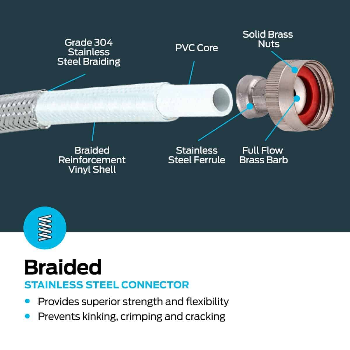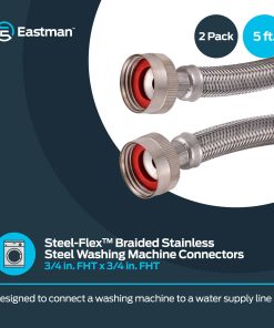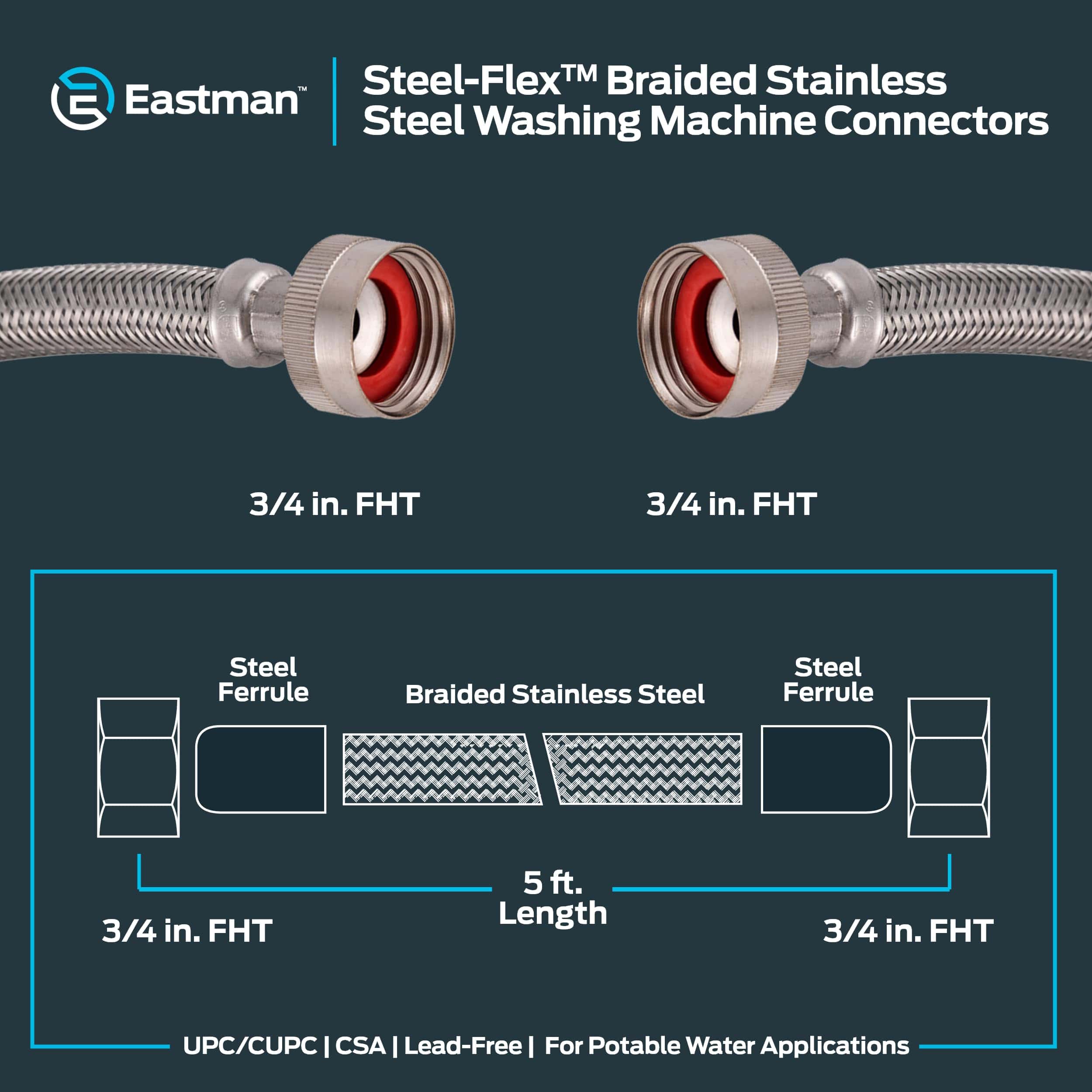 Los conectores de lavadora de acero inoxidable de 5 pies de Eastman cuentan con un núcleo de PVC, refuerzo de nylon trenzado de múltiples filamentos, una cubierta exterior de vinilo transparente y un exterior trenzado de acero inoxidable de grado 304 que está diseñado para prevenir el doblado y el abolladuras. Este kit de conexión de manguera de mezcladora de lavadora incluye 1 accesorio para agua fría y 1 accesorio de manguera para agua caliente. El kit de conexión de manguera de lavadora está destinado únicamente para uso residencial, certificado por CSA y aprobado por UPC.