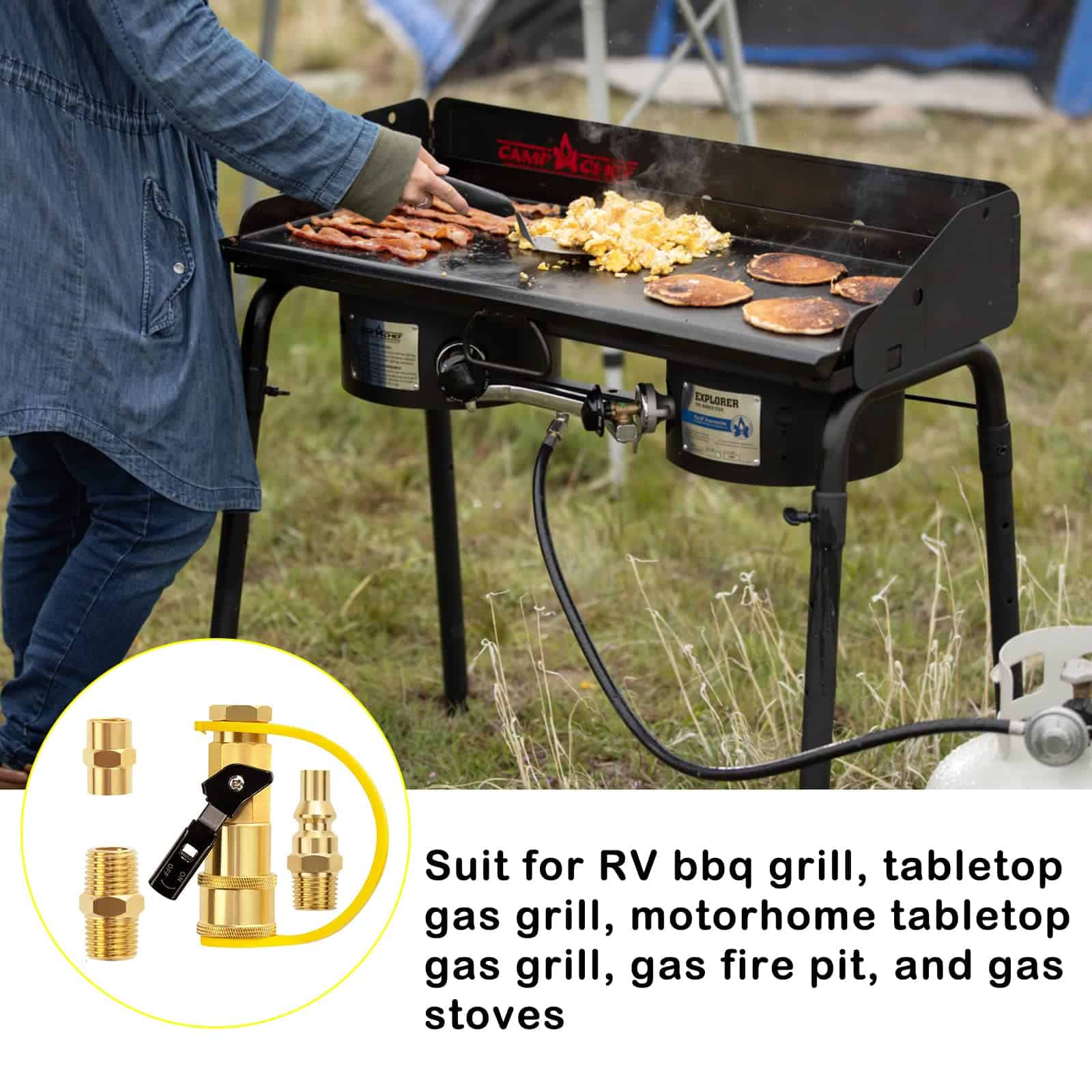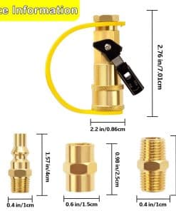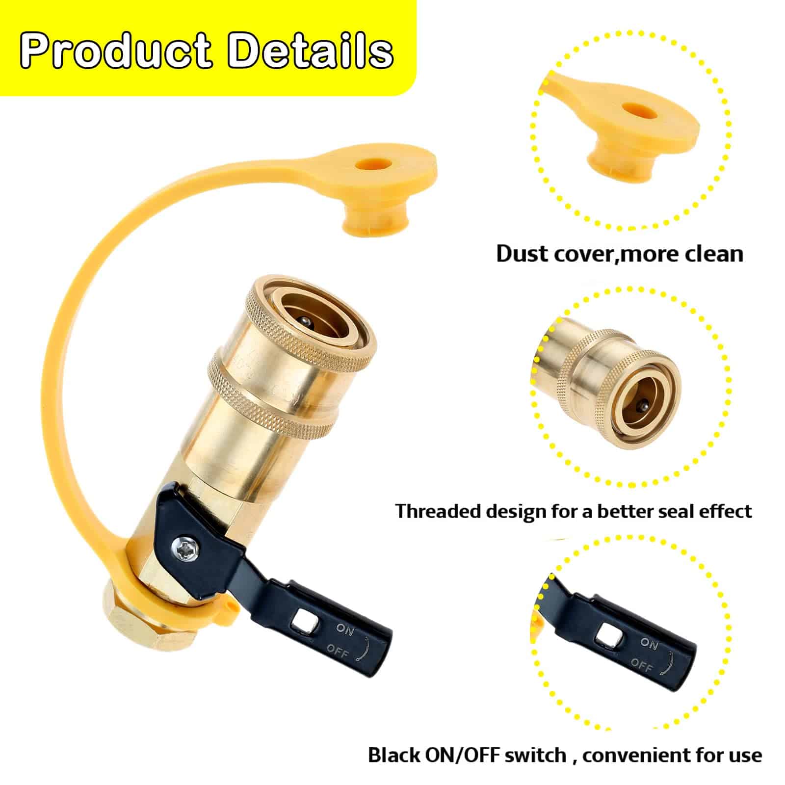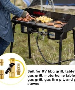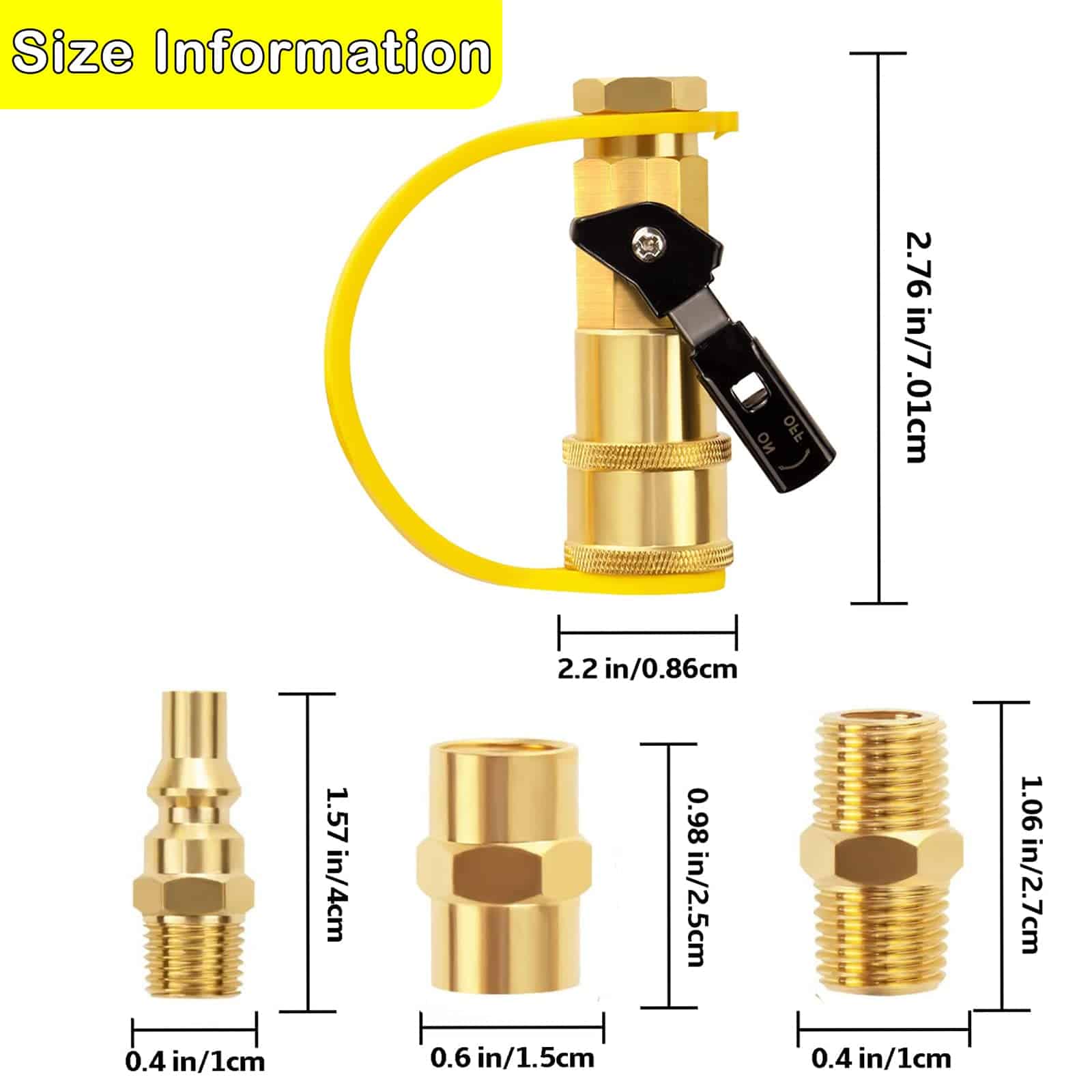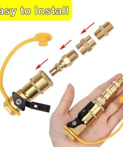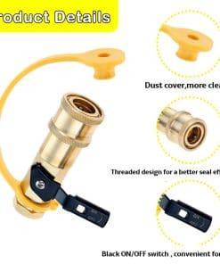 Especificaciones Tipo: Conectores Rápidos de Propano de 1/4» Aplicación: Sistema de Propano de Baja Presión Material: Latón&PTFE&PP Tamaño: Kit de Conexión Rápida de Propano de 1/4» para RV Con Válvula de Cierre: Sí Válvula: 1/4» NPT Hembra x Conexión Rápida Hembra Tapa de Flujo Completo: 1/4» NPT Macho x Conexión Rápida Macho Interruptor de Válvula de Seguridad: Hay 1 interruptor en la válvula de cierre de rosca hembra, que se puede abrir o cerrar a voluntad durante el uso. Cuando lo cierras, el gas se desconecta automáticamente. Material de Latón: Material de latón sólido de alta calidad, resistente a la corrosión, no es fácil de romper deformar, duradero. Fácil de Instalar: Adaptador para conectar a la parrilla de mesa fácil de usar, una tapa protectora podría mantenerse limpia cuando no la está utilizando, abra el interruptor negro para conectar cuando lo use. Paquete Incluido 1 x válvula de cierre para mujer, 1 x adaptador de conexión rápida para hombre, 1 x adaptador hembra de 1/4 pulgada, 1 x adaptador macho de 1/4 pulgada.