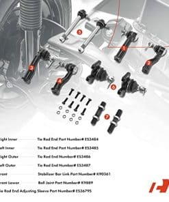 Los kits de suspensión delantera A-premium son una opción ideal para reemplazar sus kits de suspensión delantera rotos. Todos los kits de suspensión delantera cumplen o superan las especificaciones OEM. Debido al alto estándar de fabricación, vienen con una garantía de calidad de un año. Compatible con Los Modelos Kia: Compatible con Sportage 1995-2002. Piezas Incluidas en el Kit: 1x Extremo Interno de la Barra de Dirección Derecha Número de Parte ES3484, 0K01132250, 1x Extremo Interno de la Barra de Dirección Izquierda Número de Parte ES3485, 0K01132230, 1x Extremo Externo de la Barra de Dirección Derecha Número de Parte ES3486, 0K01132240A, 1x Extremo Externo de la Barra de Dirección Izquierda Número de Parte ES3487, 0K01132280, 2x Enlace de Barra de Estabilizadora delantera Número de Parte K90361, 0K01134160, 2x Junta de Rótula Inferior delantera Número de Parte K9889, 0K01134160, 2x Casquillo Ajustable del Extremo de la Barra de Dirección Número de Parte ES3679S. Número OEM: K90361, K9889, ES3484, ES3485, ES3486, ES3487, ES3679S, 0K01132250, 0K01132230, 0K01132240A, 0K01132280, 0K01134160, 0K01134160. Ubicación: Lado Delantero. Cantidad: Un Set de Diez Piezas.