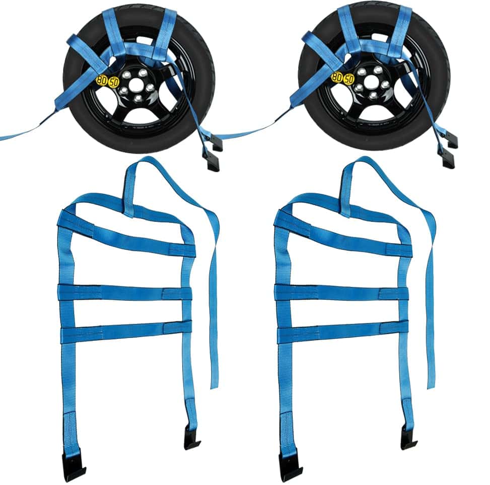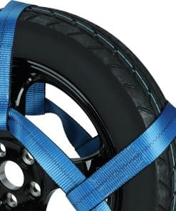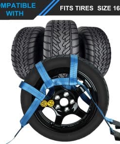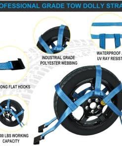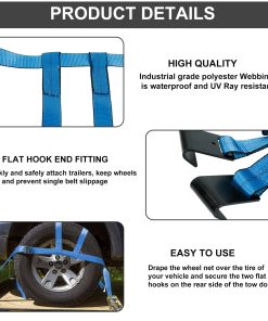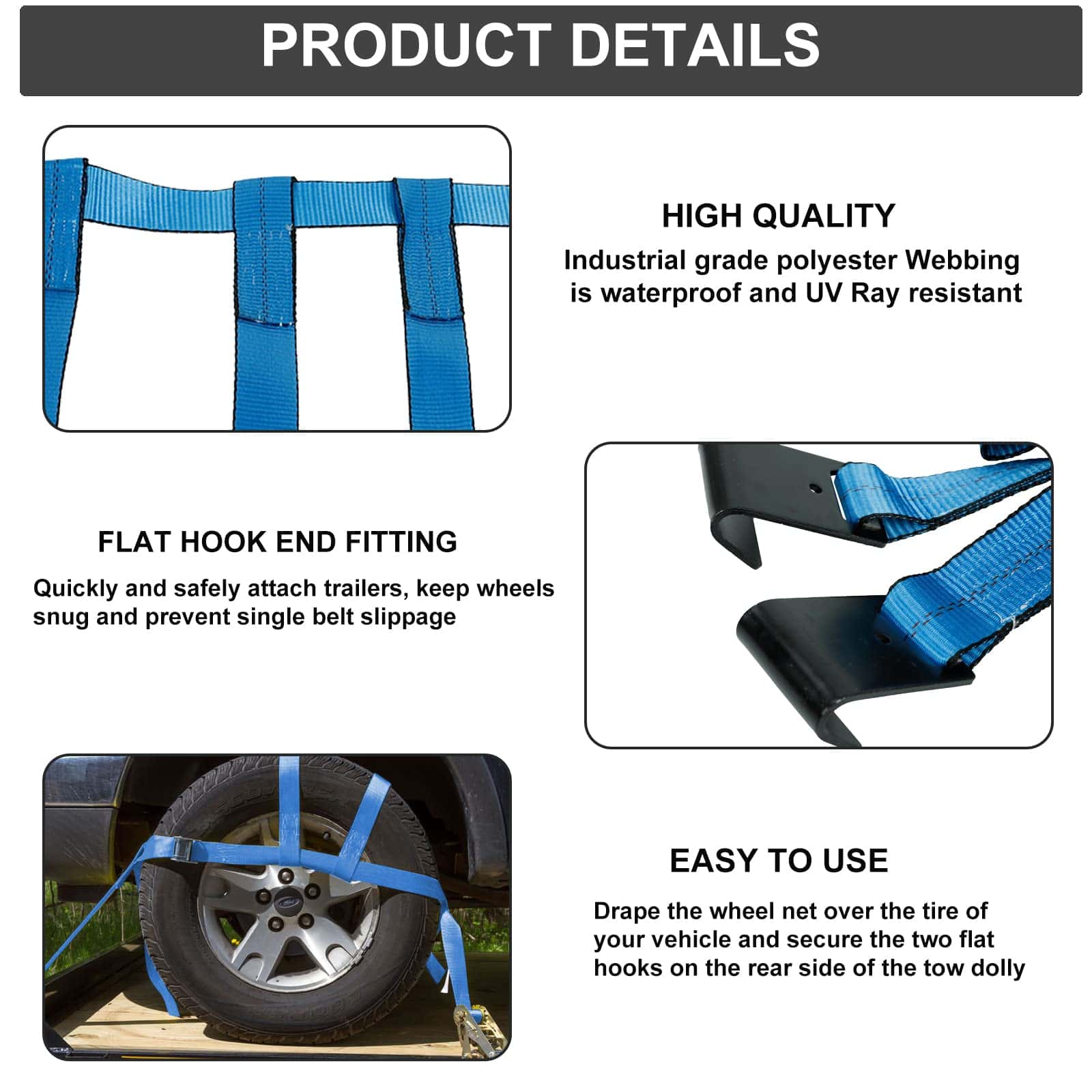 1. Protección avanzada de doble borde: Resistencia a la abrasión; Protección contra rayos UV, suciedad, y agua. 2. Hecho con cinta de poliéster industrial de 2 pulgadas para una resistencia máxima. Límite de carga de trabajo (LCW): 3,335 lb, Resistencia a la rotura: 10,000 lb. Fácil de instalar y mantener apretado y antideslizante cuando se utiliza. 3. Se adapta a tamaños de LLANTA de 15″ a 20″ en los remolques de vehículos de remolque Kar Kaddy de Demco y de 16″ a 20″ en otras marcas de remolques de vehículos de remolque. 4. Utiliza ganchos planos de 2″ en un extremo y un extremo libre de 5 pies en el otro lado para poder ser trincado. Tapas que van a través de los neumáticos de 17 1/2″. 5. Antes de comprar este producto, verifique el modelo que adquirió. Si tiene alguna pregunta, puede contactarnos por correo electrónico para asegurarle una verdadera preocupación