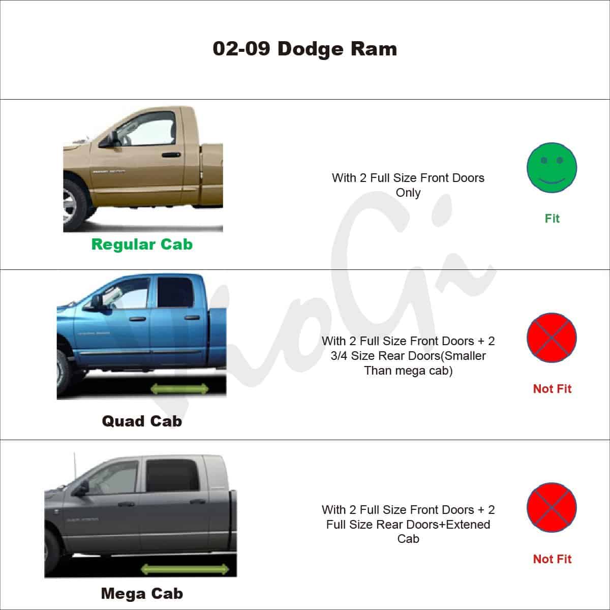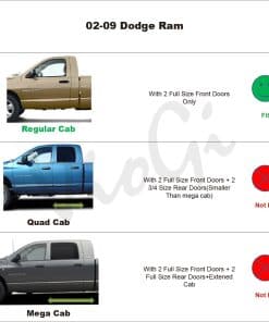 1. AJUSTE: Deflectores para Ventanas diseñados para Dodge Ram 1500 2-Puertas Cabina Estándar/Regular 2002-2008 (No compatible con Quad o Mega Cab); viseras para ventanas diseñadas para Dodge Ram 2500/3500 2-Puertas Cabina Estándar/Regular 2003-2009 (No compatible con Quad o Mega Cab).
