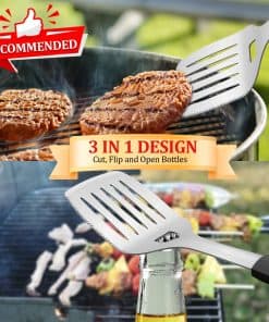 2. Juego de Herramientas de Parrilla Multiusos: La espátula de BBQ está equipada con un práctico abridor de botellas y borde dentado, que puede cortar, voltear y abrir botellas para satisfacer sus diferentes necesidades. El tenedor de parrilla afilado puede perforar fácilmente los alimentos.