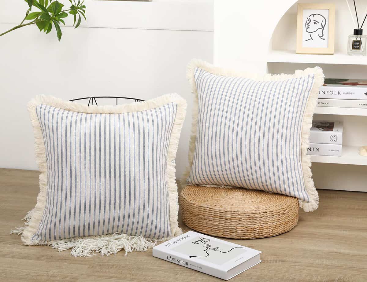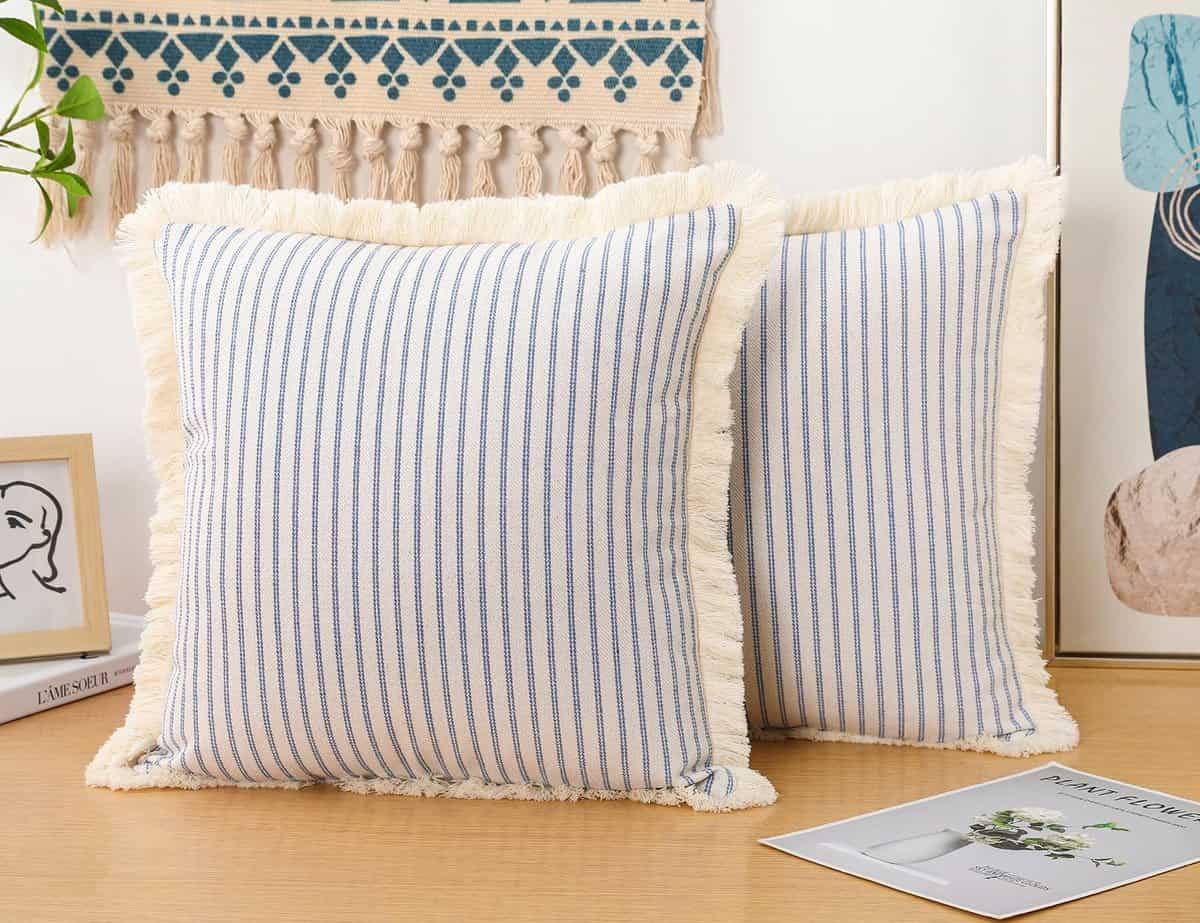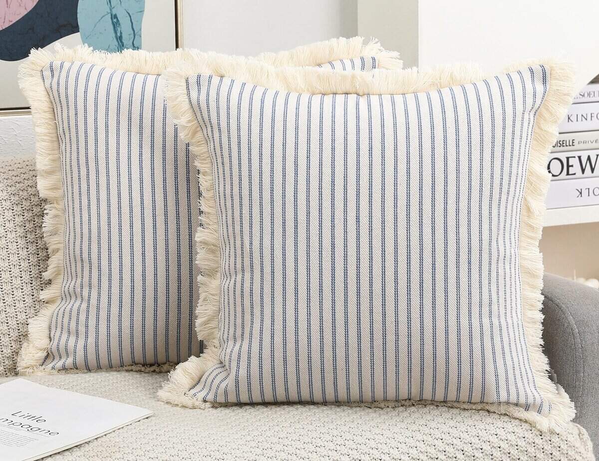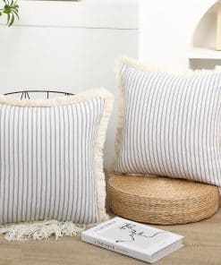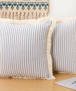 Conjunto de 2 Fundas de Cojín Boho en Azul Claro 28 x 28,Euro Sham Pillow Covers,Decorative Large Pillow Cover Pillow Case Cushion Cover for Bed Sofa Couch Farmhouse Living Room. Chic Design classic stripes pattern boho pillow covers.Double-sided design and 1 inch beige hand-finished fringe around its border makes the pillow cover more unique,go well with boho or farmhouse, ethnic, retro, and chic style decor. Material&Package cotton,these decorative neutral throw pillow covers are woven with light blue tassels and white base fabric. WORKMANSHIP We use Invisible zipper in the same color as the pillowcase, which is elegant and easy to remove. Each suture is reinforced to make the pillowcase more durable. Nursing Tips For the woven tufted pillow covers, we recommend hand washing separately. To prolong the life of the tufting, turn the pillowcase inside out and then hand wash it. The first cleaning may have some floating fiber, which is normal. NOTICE The package contains 2 pillow cover without inserts.SIZE :28×28 inches(70 x 70 cm).To make the best quality pillow case, your 100% satisfaction is our ultimate pursuit.
