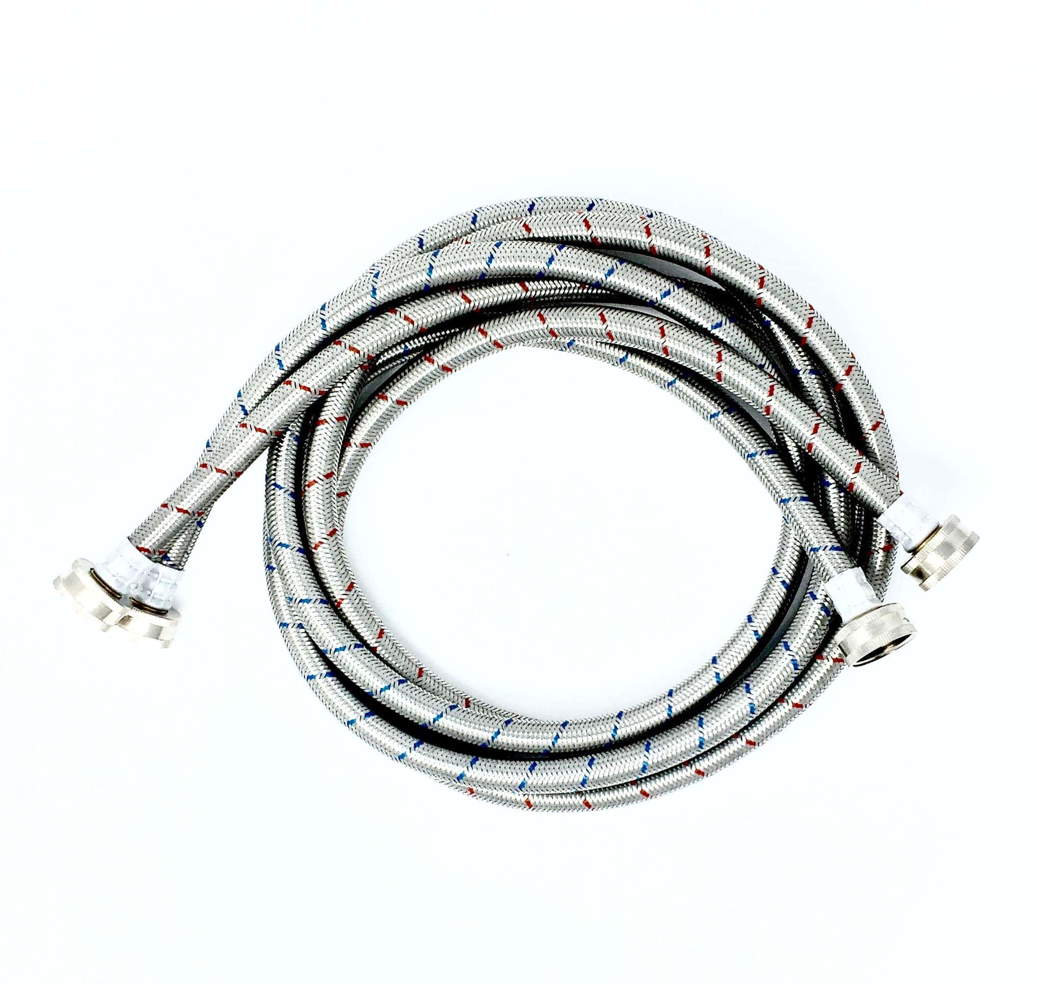 Conjunto de 2 mangueras trenzadas de acero inoxidable de 6 pies forradas en rojo y azul para lavadora con conector universal de 3/4″. Características clave: Núcleo de PVC de dos capas con refuerzo de nylon en medio y cubierta exterior trenzada de acero inoxidable 304 para aplicaciones de suministro de agua de alto rendimiento y durabilidad. El conector universal se adapta a todas las lavadoras. Cumple con los estándares ASME A112.18.6-2017/CSA B125.6-17, NSF/ANSI 61,372. Mientras que la presión típica del suministro de agua oscila entre 50 y 80 psi, nuestras mangueras están clasificadas en 290 psi con una resistencia a explosiones de hasta 1500 psi. El rango de temperatura de trabajo va de -40 a 210F. Viene con una garantía de 10 años para una mayor tranquilidad.