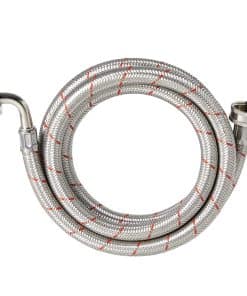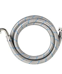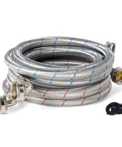 Utilice este conjunto de 2 mangueras de suministro de lavadora universales para mejorar instantáneamente su cuarto de lavado o para una nueva instalación de lavadora. Cada manguera de lavadora viene con una franja de color rojo o azul para indicar la temperatura del agua caliente o fría. Las mangueras cuentan con una conexión de codo de 90 grados y miden 6 pies de largo, lo que significa que tendrá suficiente espacio donde decida colocar su lavadora. Cada manguera está hecha de PVC duradero y acero inoxidable con una cubierta trenzada externa protectora para ayudar a prevenir la oxidación y la ruptura.