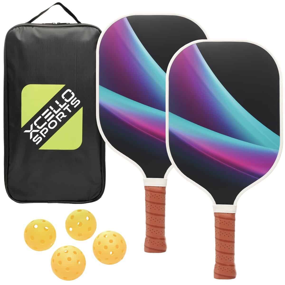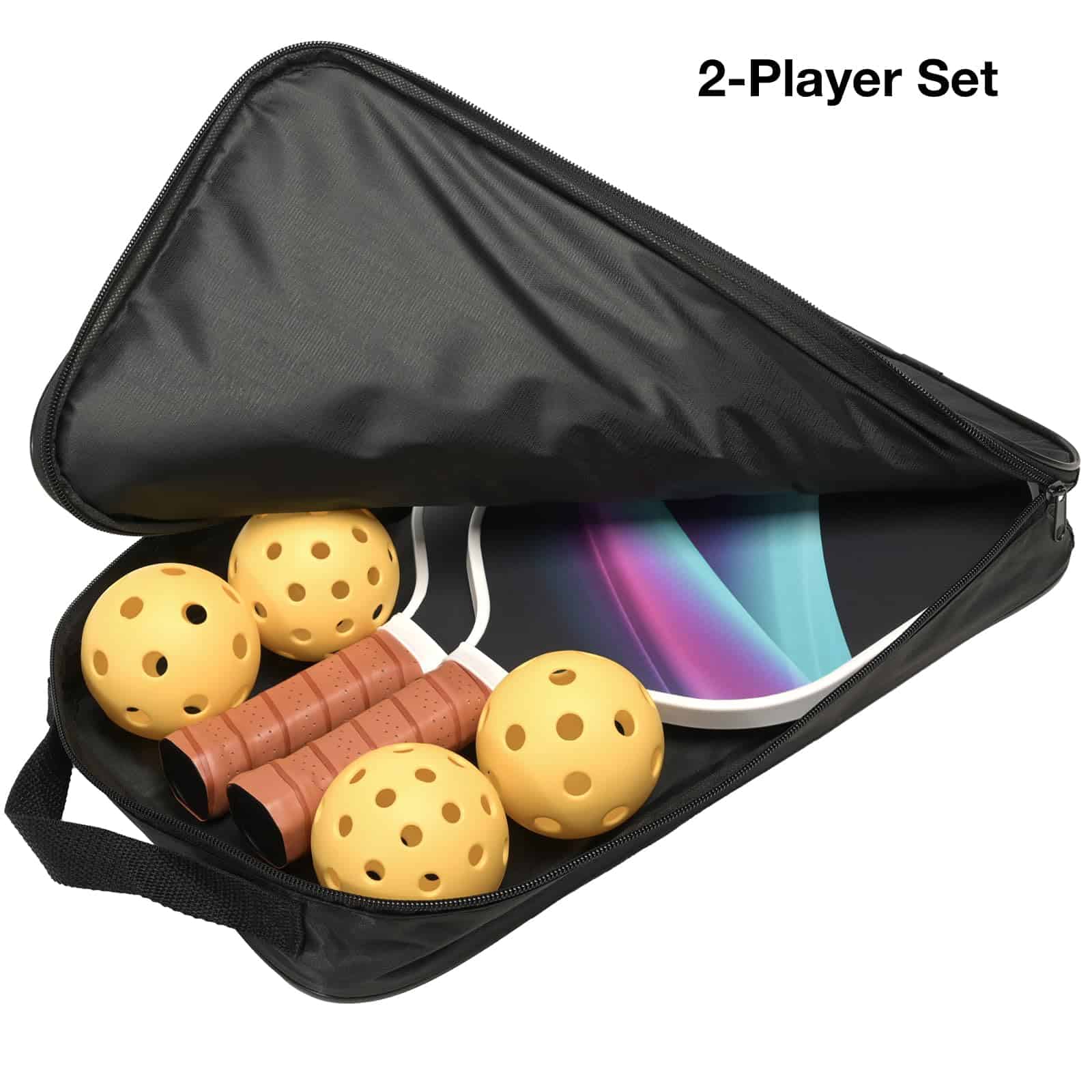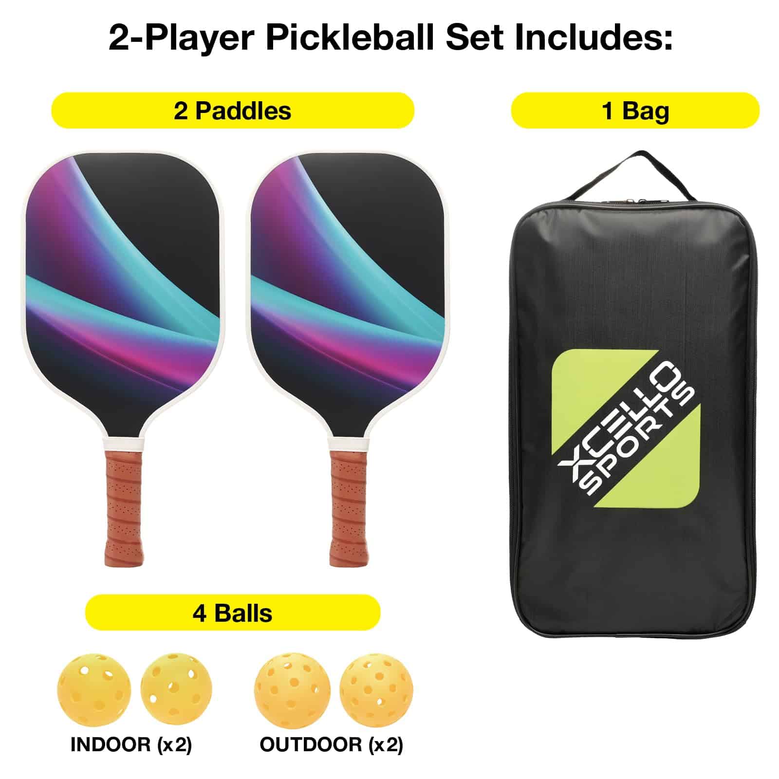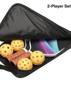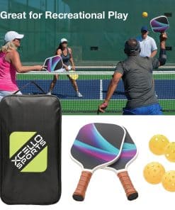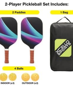 2. JUEGO COMPLETO: Incluye 2 paletas de pickleball de fibra de vidrio, 4 pelotas de pickleball amarillas brillantes (2 para uso en interiores, 2 para exteriores) y una bolsa de almacenamiento con cremallera para un fácil transporte y almacenamiento.