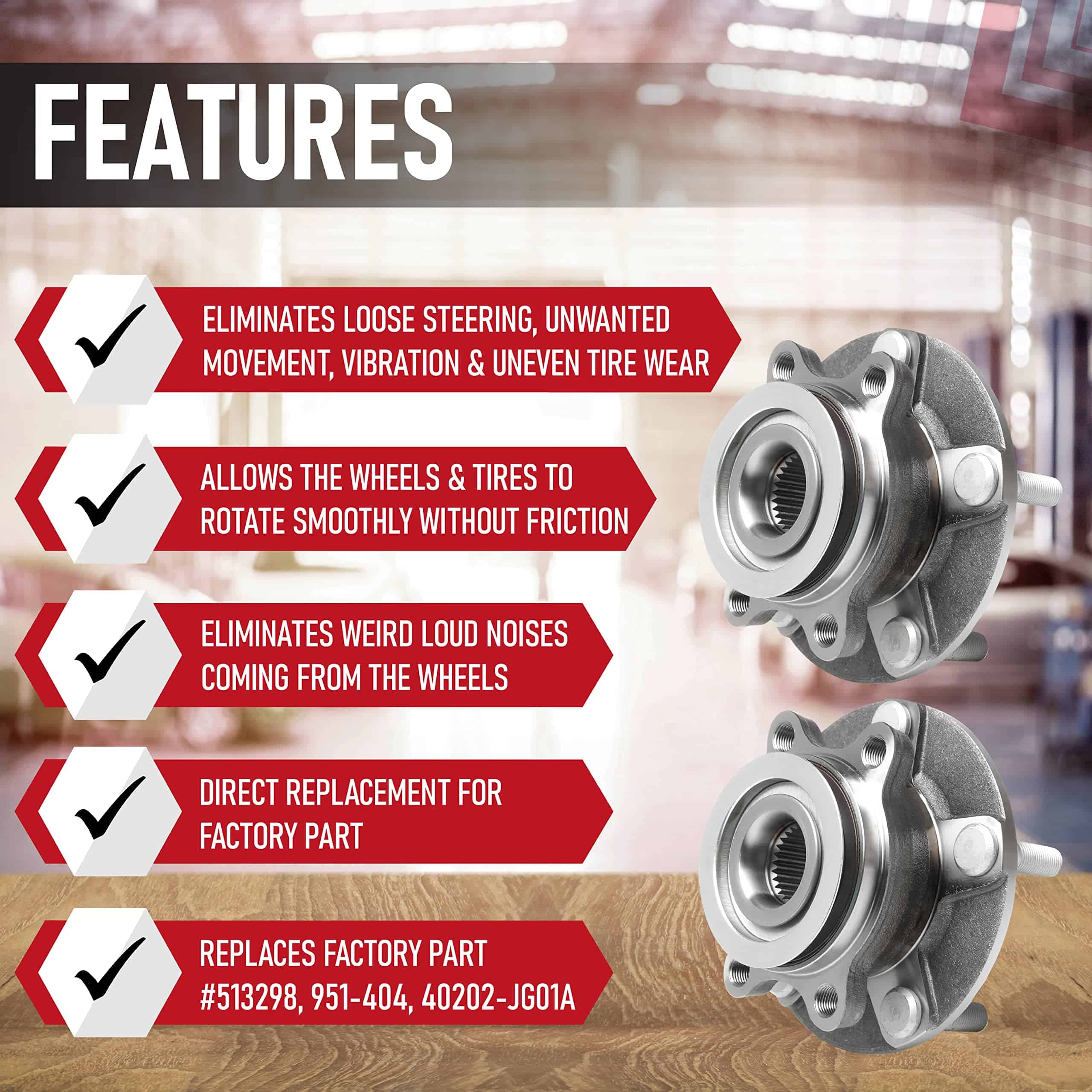 El rodamiento de buje de rueda es una parte crucial del tren motriz ya que permite que las ruedas y neumáticos giren suavemente sin fricción. Los problemas de rodamientos de buje de rueda se pueden identificar fácilmente por ruidos fuertes en el área de la rueda, dirección suelta o movimiento no deseado, vibración y desgaste desigual de los neumáticos. La instalación es fácil y no se necesitan herramientas especiales, se ajusta, se ve y funciona como el rodamiento de buje de fábrica. Por favor, asegúrese de que su vehículo tiene 5 cuentas de pernos antes de comprar. Se ajusta a la izquierda o derecha delantera de los siguientes vehículos: Rogue 2.5L 2008-2015 Sentra 2.5L 2007-2012 Reemplaza a los números de parte: 513298, 951-404, 40202-JG01A, 750-0021, BR930772, HA590278 Este es un repuesto compatible fabricado por AA Ignition. Este conjunto de rodamientos de buje no es una pieza OEM genuina. Las marcas de vehículos y sus modelos asociados y los números de parte se utilizan en esta lista solo para identificar los vehículos a los que se ajusta este conjunto de rodamientos de buje de rueda.