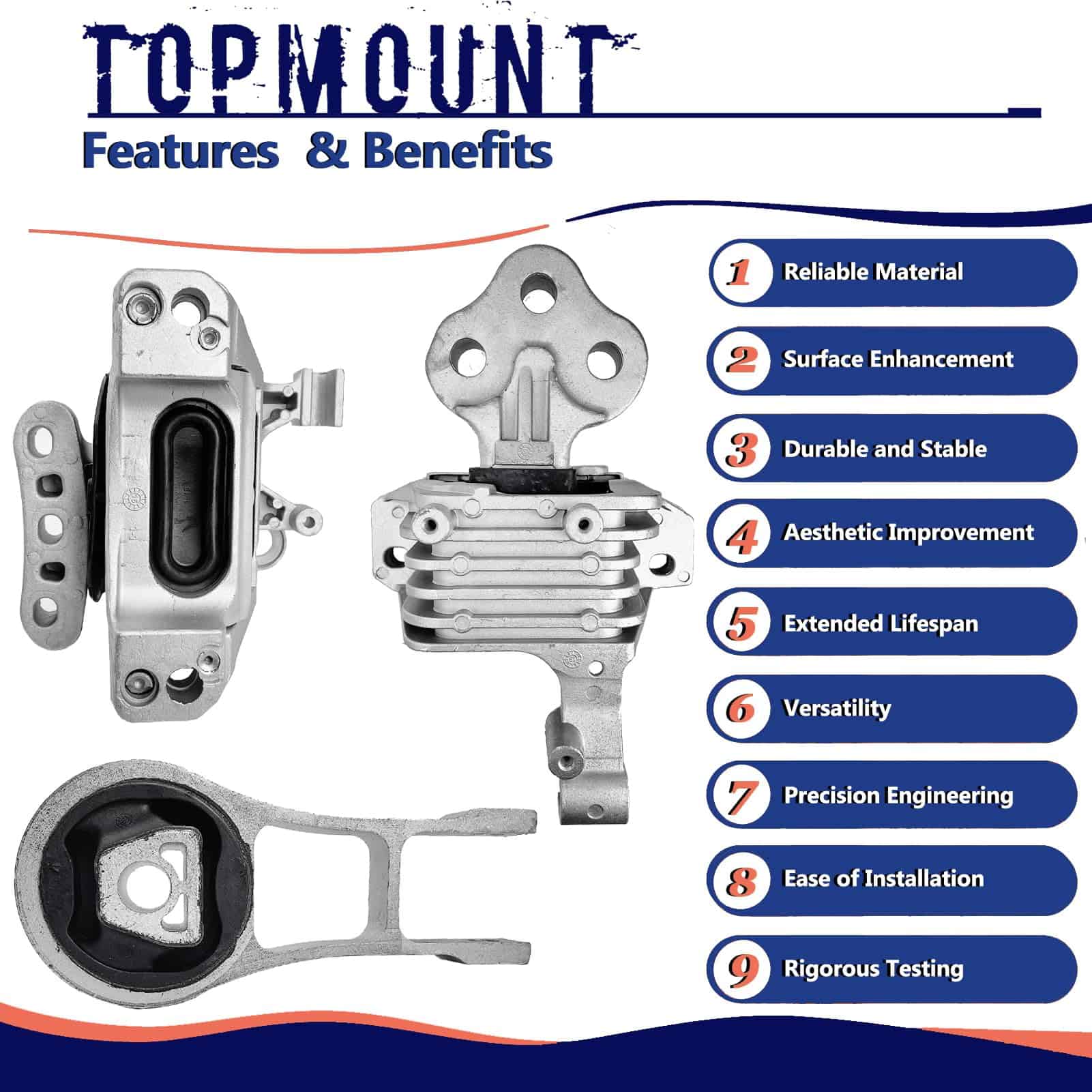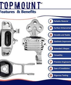 3. Mejoras de rendimiento: Mejora tu experiencia de conducción reemplazando las partes desgastadas con nuestro soporte de motor TOPMOUNT. Disfruta de cambios de marcha más suaves, vibraciones del motor reducidas y tracción mejorada para una experiencia de conducción más satisfactoria.