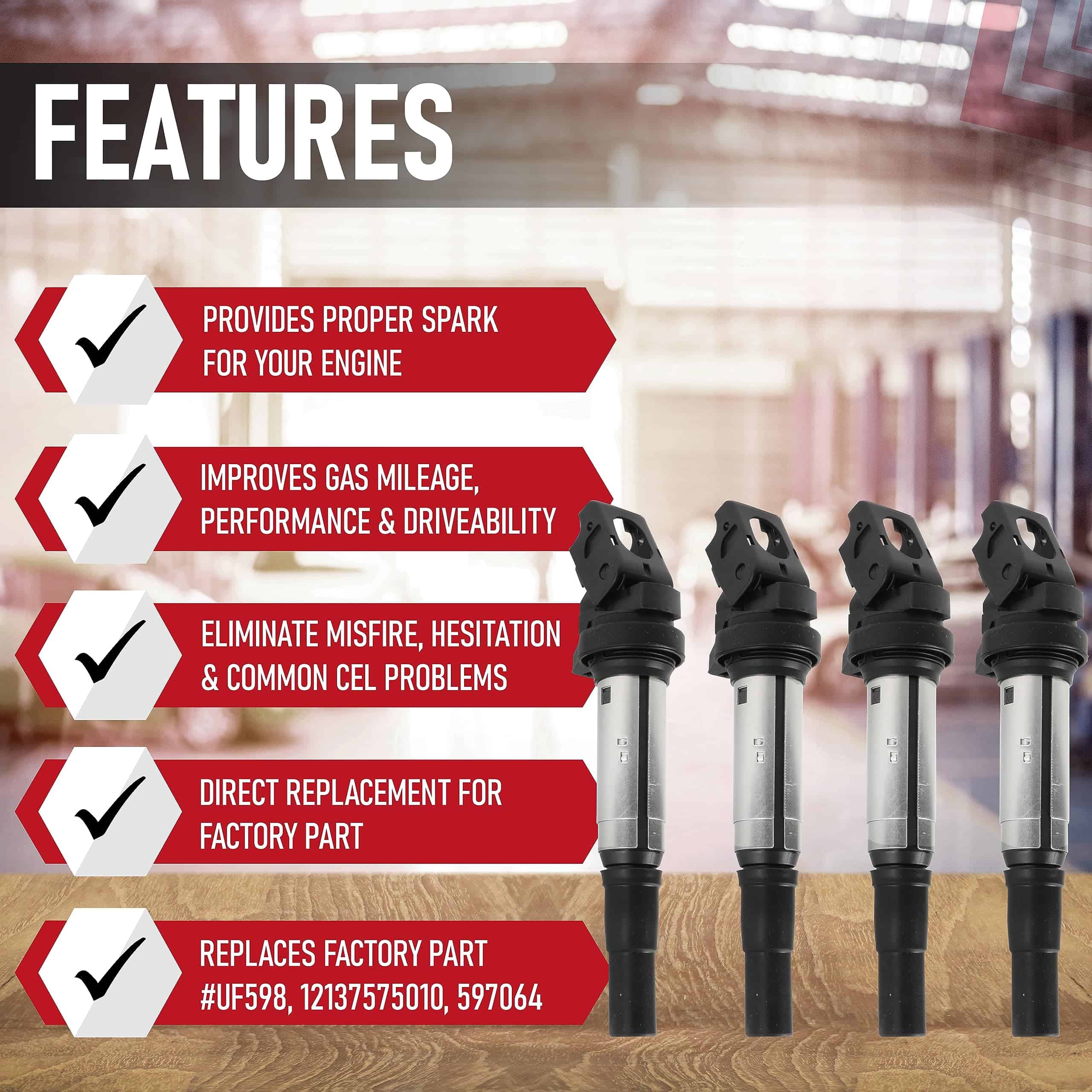 Conjunto de 4 bobinas de encendido de reemplazo compatible con Mini 1.6L, que incluye modelos Cooper, Countryman y Paceman. Estas bobinas proporcionan la chispa necesaria para encender el motor de su vehículo. A lo largo del tiempo, las bobinas de encendido de fábrica pueden presentar fallas, lo que lleva a un bajo rendimiento de combustible, hesitación durante la conducción y la activación de la luz de advertencia del motor. Reemplace las bobinas defectuosas con este conjunto de 4 bobinas de encendido y restaure el rendimiento y la capacidad de manejo de su vehículo. Este conjunto es un reemplazo compatible para las partes UF-598, UF598, 12137575010, 12 13 7 575 010, 12137550012, 12 13 7 550 012, 0221504470, 0 221 504 470, 0221504800, 0 221 504 800, 597064, 597091, 48033, 48206, 880424, 880200, IC09108-026, 20360, GN10572-12B1, C1692, 5C1749, 12138616153 que se encuentran comúnmente en los vehículos Cooper, Cooper Countryman y Cooper Paceman. Este conjunto de bobinas ofrece un ajuste, calidad y acabado similares a las piezas OEM, lo que le permite ahorrar tiempo y dinero al reemplazarlas usted mismo. Además, viene con una garantía de 2 años o 24,000 millas, por lo que si alguna de las bobinas falla dentro de este período, puede contactarnos para obtener un reemplazo. Este producto es una excelente opción para mantener su vehículo funcionando sin problemas y de manera eficiente.