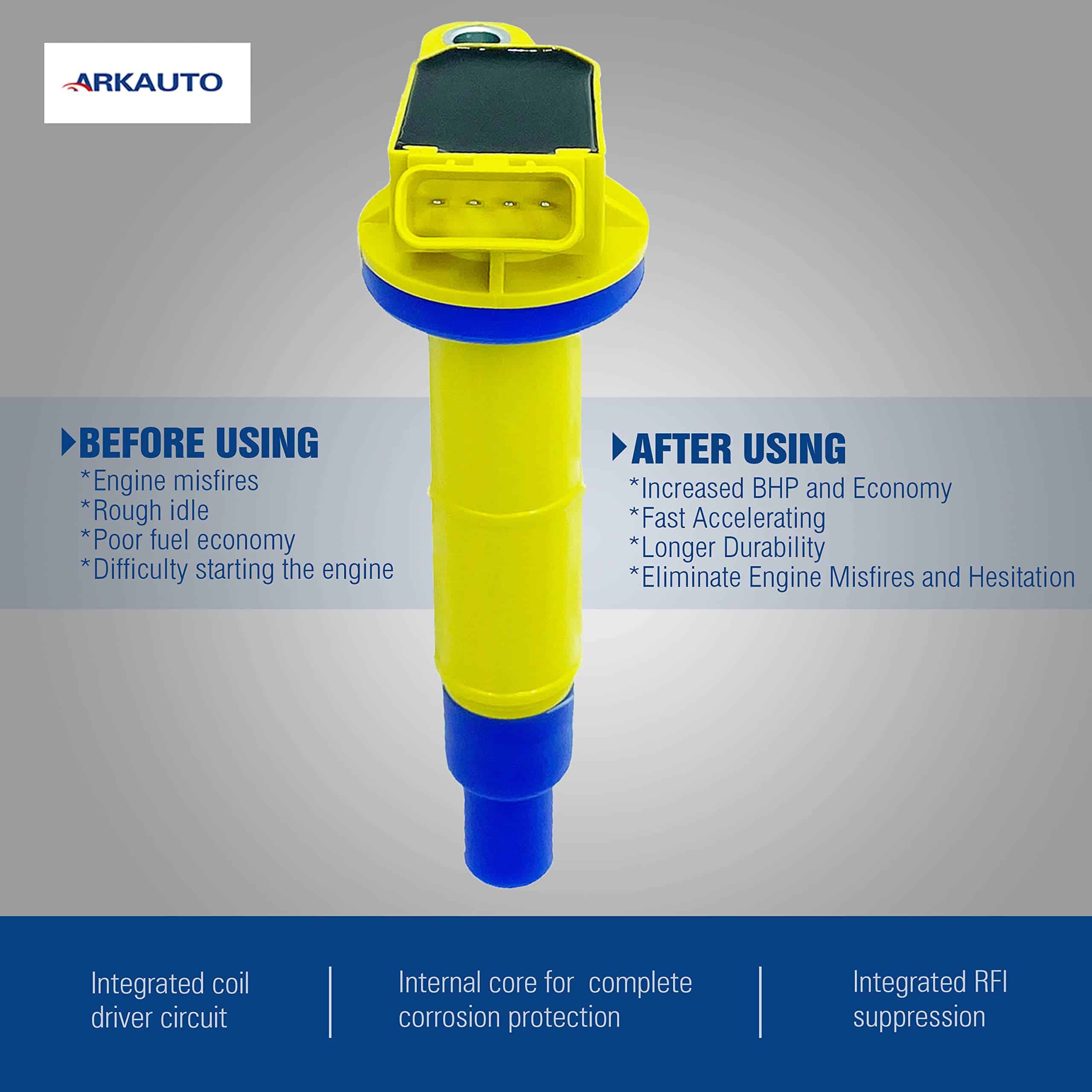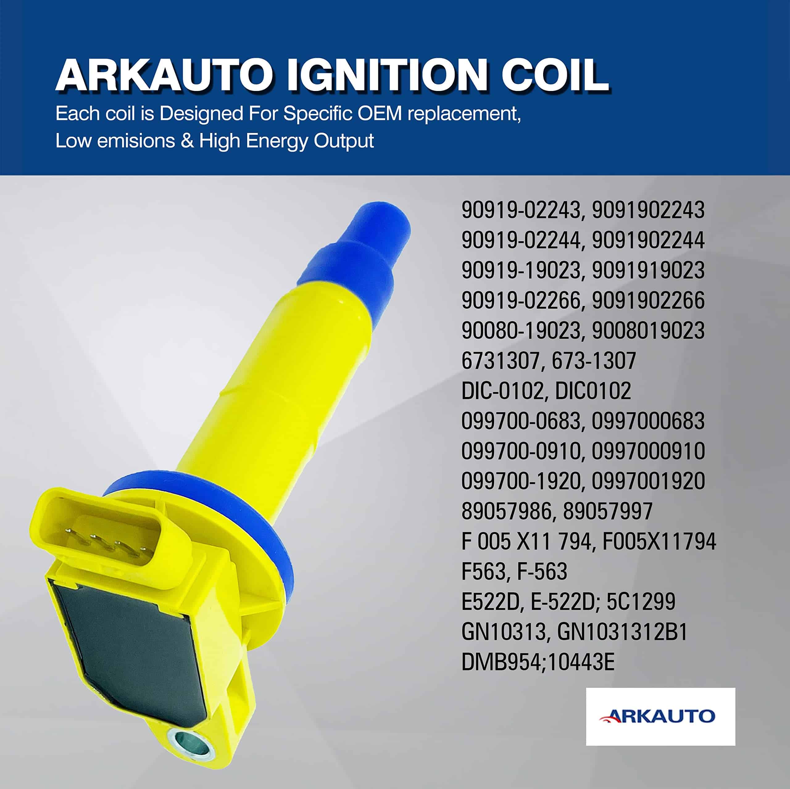 Las bobinas de encendido ARKAUTO siempre están hechas con cobre de alta calidad, diseñadas para aplicaciones específicas y probadas en carretera. Por favor, revise cuidadosamente la información a continuación para asegurarse de que esta pieza sea compatible con su vehículo. Las bobinas de encendido ARKAUTO están diseñadas de acuerdo con los tipos originales de OE, que pueden reemplazar sus bobinas defectuosas originales perfectamente y funcionar como las originales. Esta bobina es un reemplazo para OE: 9091902244 9091902243 9091902266 9008019023 UF333, 9091902244 90919-02243 90919-02266 90080-19023 UF-333 los compradores deben comparar con cuidado la OE con sus coches originales antes de hacer el pedido para evitar comprar una pieza incorrecta y causar una pérdida innecesaria. Compatible con TOYOTA Corolla Camry Highlander Matrix RAV4 Solara Scion tC xB Lexus ES240 HS250H 2.0 2.4 L4 1AZ 2AZ. Reduce problemas comunes de las bobinas de encendido como; arranque nulo/difícil, tiempo de arranque prolongado, fallos en la ignición, falta de potencia, cambios inconsistentes en la transmisión, enchufes de bujías ensuciados, fallo prematuro del convertidor catalítico, mala economía de combustible, encendido de la luz de revisión del motor. Garantía limitada de 1 año. Por favor, use para verificar si esta pieza es compatible con su vehículo.