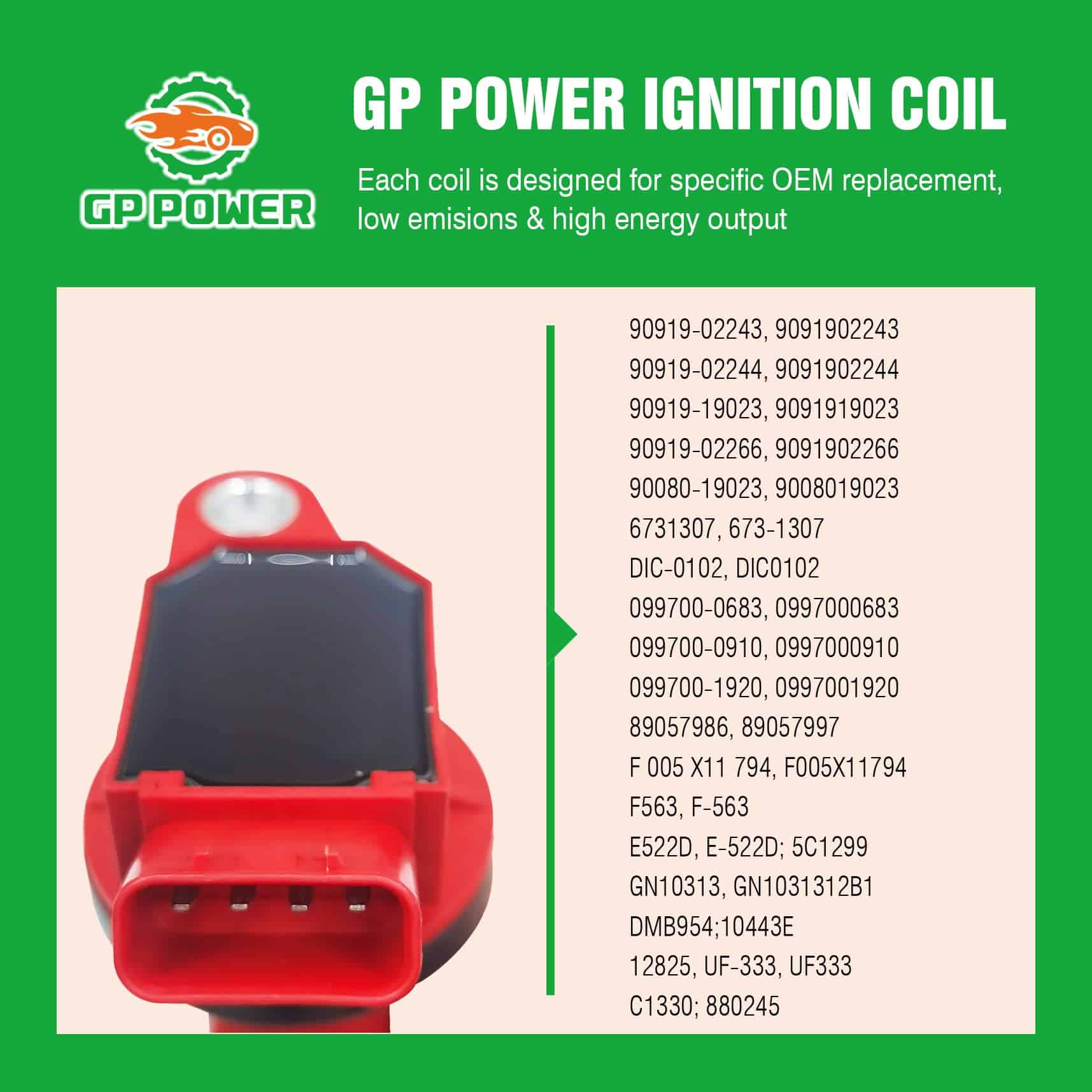 GP POWER Bobinas de encendido siempre están fabricadas con cobre de alta calidad, diseñadas para una aplicación específica y probadas en la carretera. Utilizamos la última tecnología y componentes OE para ofrecer una calidad excepcional que supera los requisitos OE. Nuestras bobinas de encendido se pueden instalar fácilmente en ambos lados del motor en el compartimiento del motor y en minutos, para que pueda experimentar arranques de motor más consistentes y suaves de inmediato. Excelente confiabilidad y rendimiento, reemplazo directo en la ubicación de fábrica, reemplaza el número de parte original. Reduce problemas comunes de bobinas de encendido como; arranque difícil/sin arranque, tiempo de arranque prolongado, fallos de encendido, falta de potencia, cambios de transmisión inconsistentes, ensuciamiento de bujías, falla prematura del convertidor catalítico, mala economía de combustible, iluminación del indicador del motor de control. Garantía limitada de 1 año – Por favor, consulte para ver si esta pieza es compatible con su vehículo.
