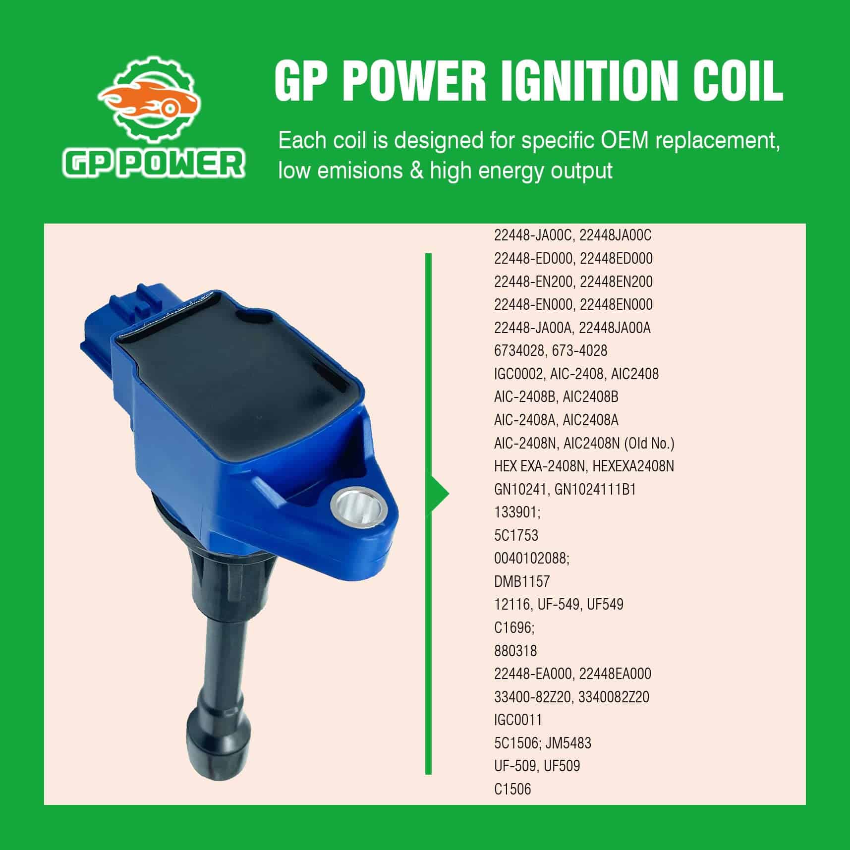 GP POWER Ignition coils are always made with high grade copper, designed for specific application and tested on road. Please review the information below carefully to make sure this part compatible with your vehicle. GP POWER utilize the latest OE technology and components to bring exceptional quality to exceed OE requirements. Our ignition coil packs can be easily located on both sides of the engine inside the engine bay which can be installed in minutes.you can experience more consistent, smooth engine starts right away. Excellent Reliability And Performance, Direct Bolt-in Replacement in Factory Location, Replaces Original Equipment Part Number. Reduces common ignition coil issues such as; no/hard start, long crank time, misfires, lack of power, inconsistent transmission shifts, spark plug fouling, premature catalytic converter failure, poor fuel economy, check engine light illumination. 1 Year Limited Warranty – Please use see if this part is compatible with your vehicle