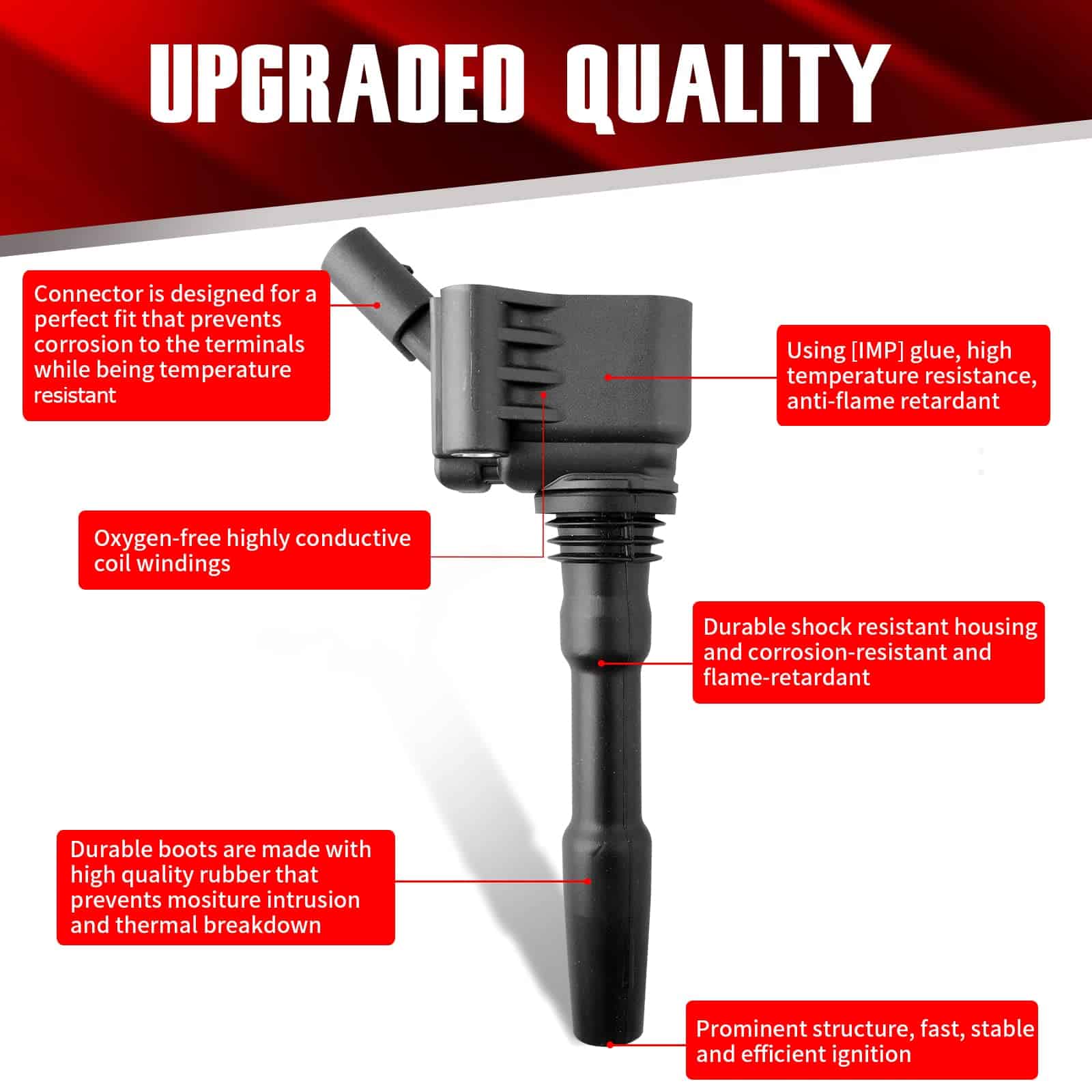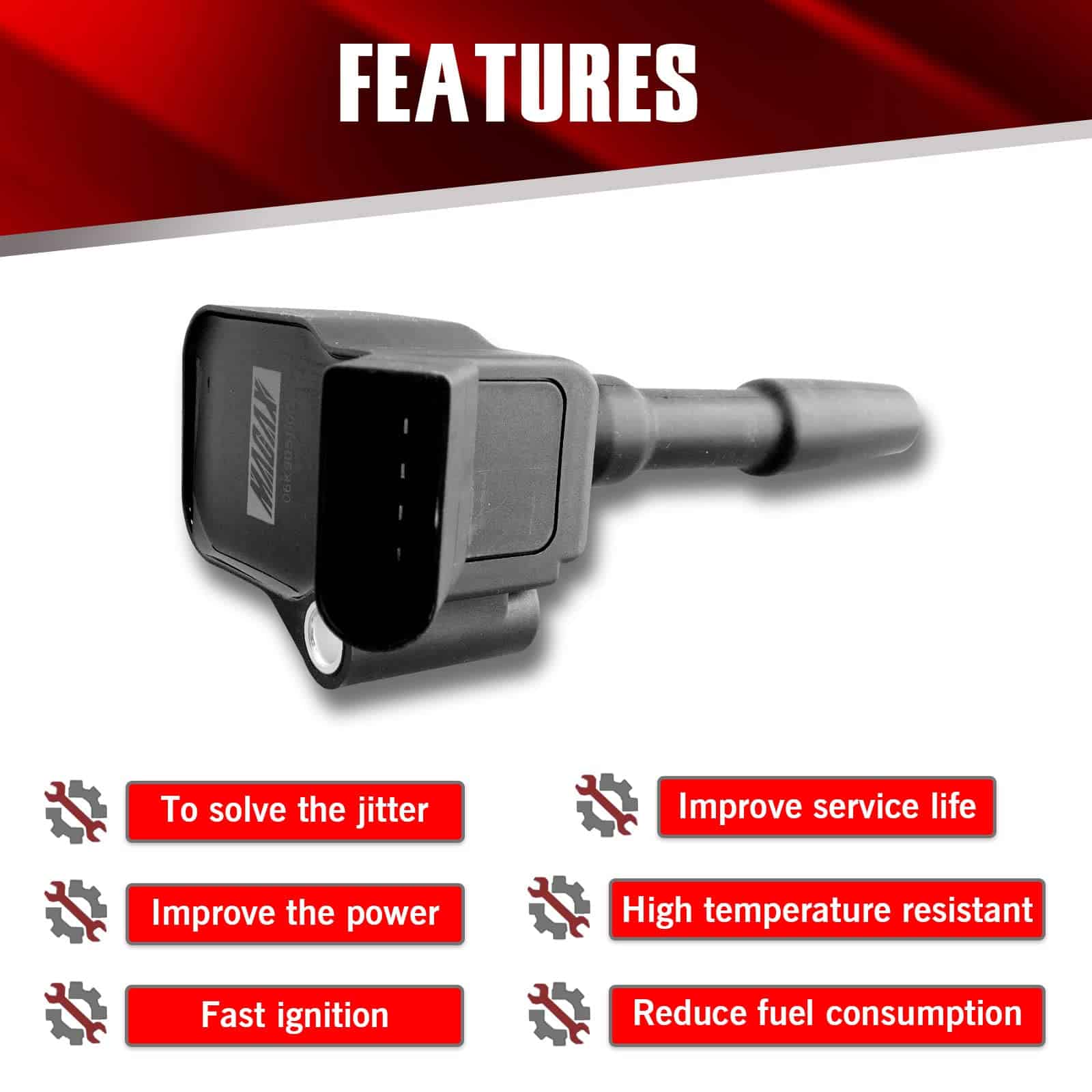 Paquete que incluye: 1. Bobina de Encendido 4 2. Herramienta de extracción de bobina de encendido 1 Compatible con: 2017-2020 Audi A4 2.0L L4 2017-2020 Audi A4 Quattro 2.0L L4 2017-2020 Audi A4 Allroad 2.0L L4 2018-2020 Audi A5 Quattro 2.0L L4 2019-2020 Audi A5 Sportback 2.0L L4 2019-2020 Audi A6 Quattro 2.0L L4 2019-2021 Audi Q3 2017-2020 Audi Q5 2.0L L4 2020 Audi Q5 PHEV 2.0L L4 2017-2020 Audi Q7 2.0L L4 2020-2021 Audi Q7 3.0L V6 Compatible con: 2018-2020 Volkswagen Atlas 2.0L L4 Compatible con: 2015-2017 Volkswagen Beetle 1.8L L4 Compatible con: 2015-2019 Volkswagen Beetle 2.0L L4 Compatible con: 2016-2018 Volkswagen Golf 1.8L L4 Compatible con: 2017-2019 Volkswagen Golf Alltrack 1.8L L4 Compatible con: 2015-2019 Volkswagen Golf Sportwagen 1.8L L4 Compatible con: 2016-2018 Volkswagen Jetta L4 1.8L Compatible con: 2016-2019 Volkswagen Jetta L4 2.0L Compatible con: 2016-2017 Volkswagen Passat 1.8L L4 Compatible con: 2018-2019 Volkswagen Passat 2.0L L4 Compatible con: 2018-2019 Volkswagen Tiguan 2.0L L4 Compatible con: 2018 Volkswagen Tiguan Limited 2.0L L4 Sustituye a los siguientes números de parte: 06J 905 110G / 06K 905 110K / 06K905110K, 06J 905 110G / 06J-905-110-G, ZSE 068 / ZSE 068 0040102068 / ZSE 068, 06J 905 110 G, ZSE 0680040102068 Por qué y cuándo debería reemplazar bobinas de encendido Las bobinas de encendido fallarían debido a la edad, el uso excesivo o simplemente defectos de fabricación. El material puede agrietarse o derretirse debido al calor de los terminales eléctricos. Reemplace sus bobinas de encendido tan pronto como su auto comience a mostrar signos de fallo de encendido, aparezca la luz de revisión del motor o si el manual de su vehículo sugiere que las reemplace después de un período de tiempo.